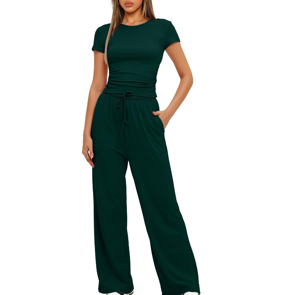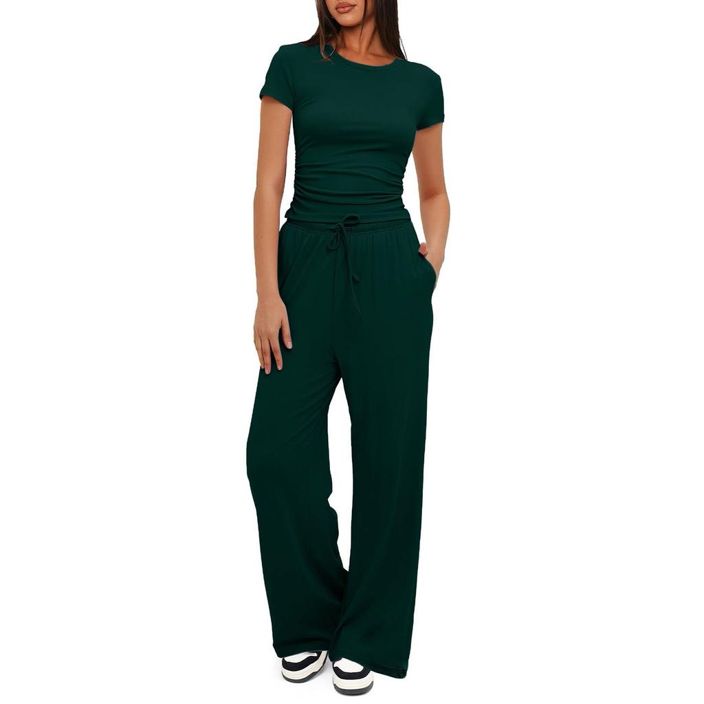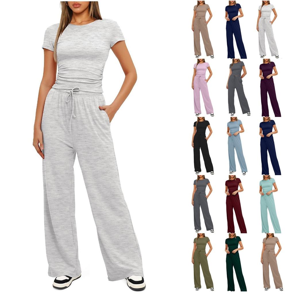 Женские комплекты из 2 предметов, летние топы с короткими рукавами и рюшами и широкие брюки, спортивный костюм, одинаковые наряды