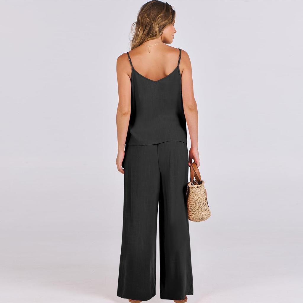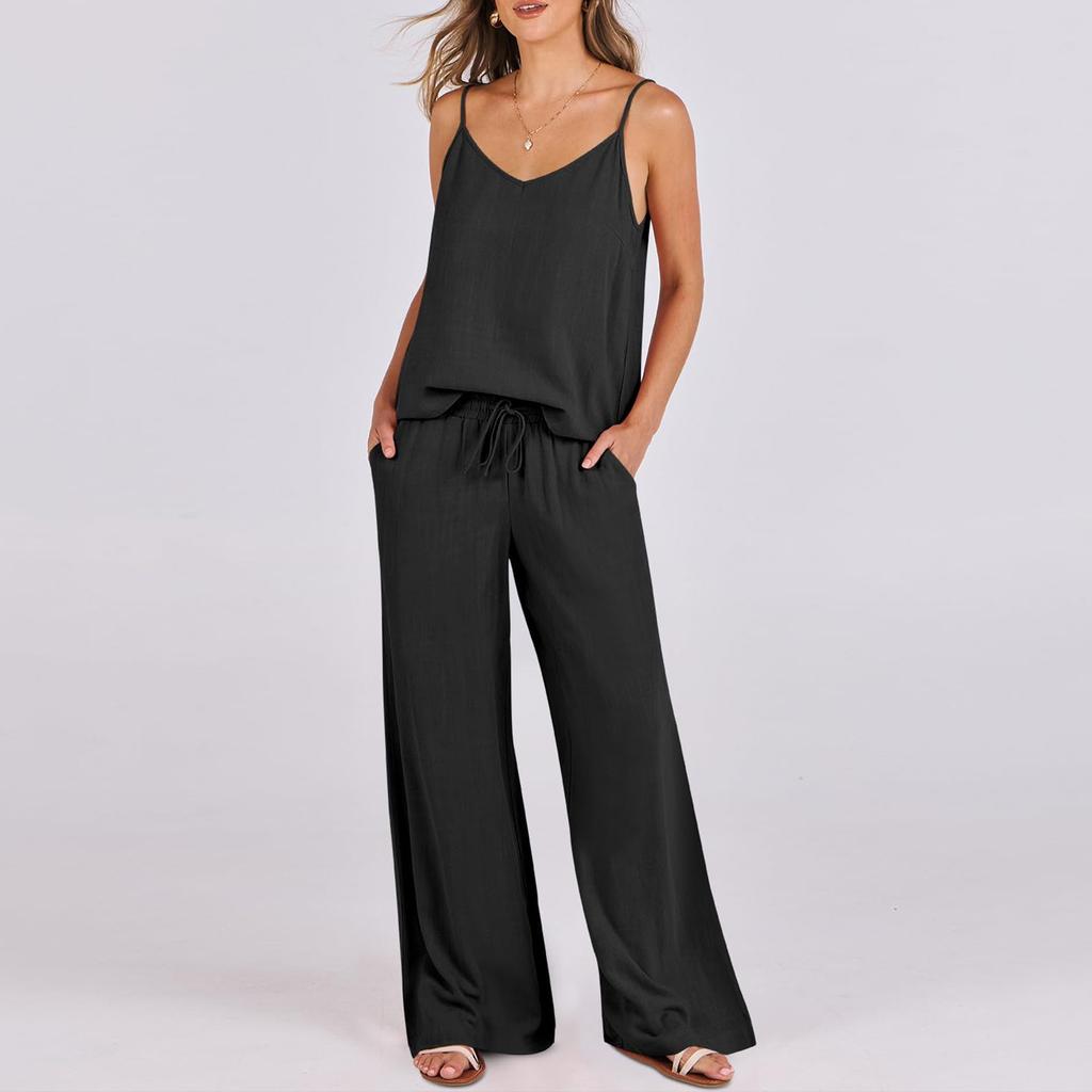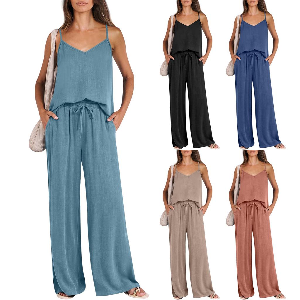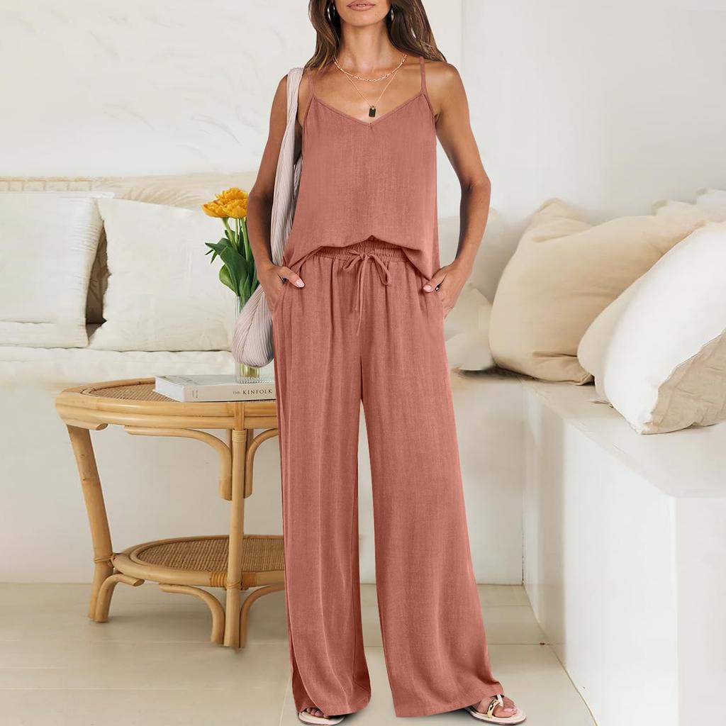 Женский комплект из 2 предметов: льняные топы без рукавов, широкие брюки на шнурке, одинаковый комплект с карманами