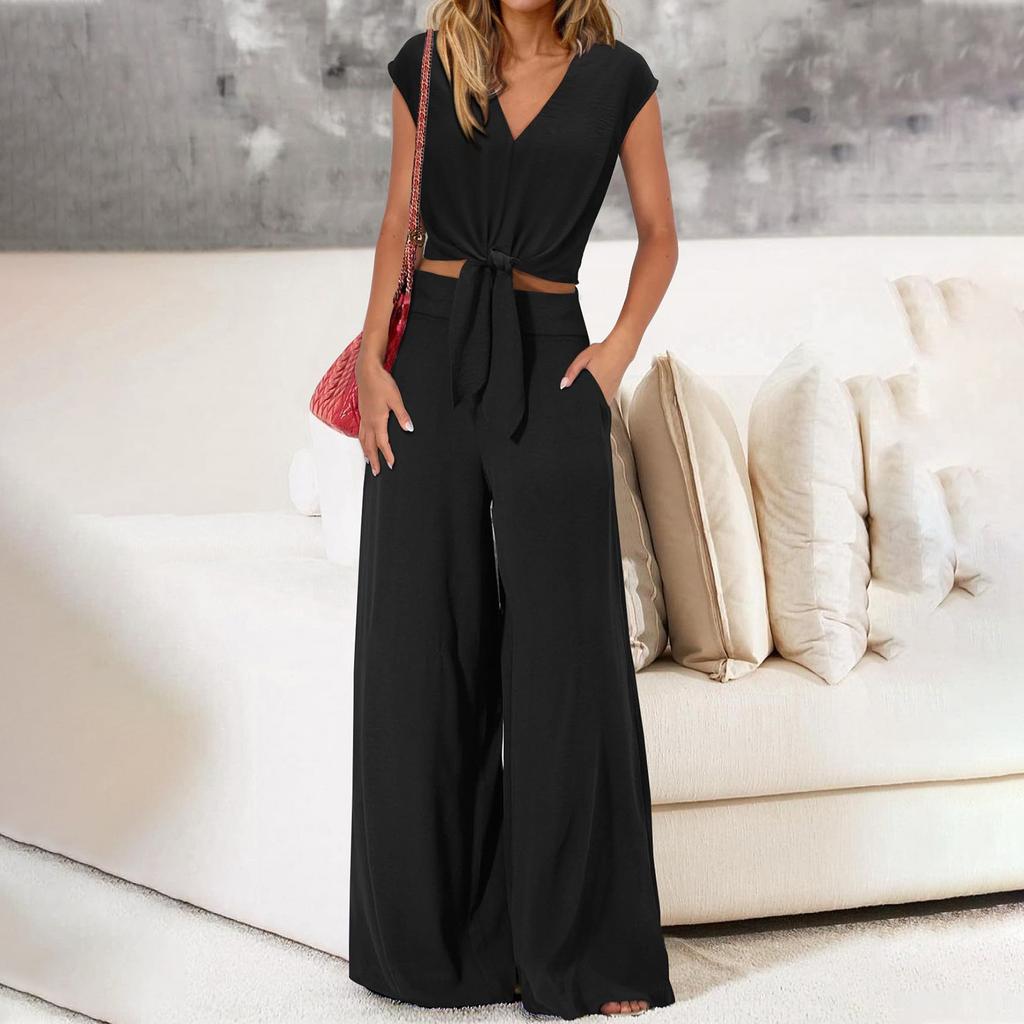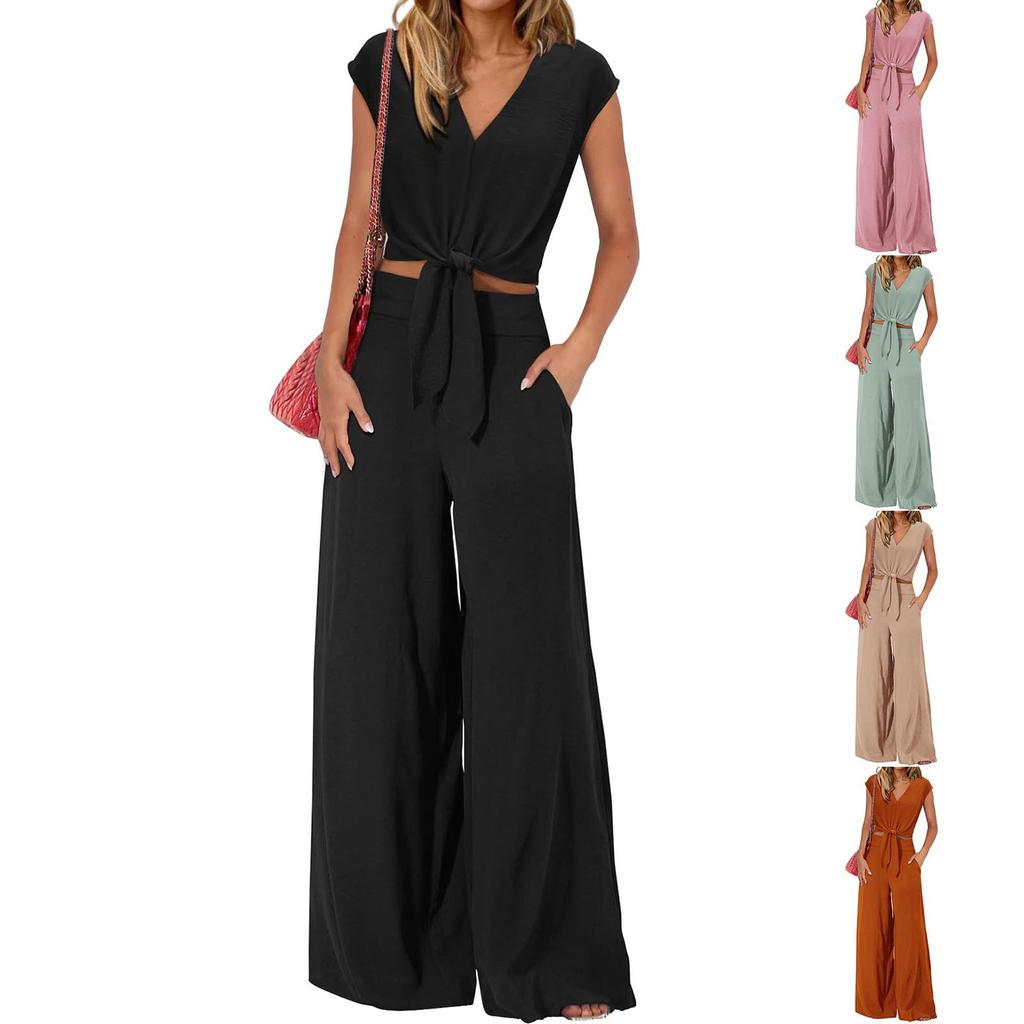 Характеристики: Женский брючный костюм-двойка, летняя одежда, топ с V-образным вырезом и запахом, сексуальная рубашка без рукавов с кепкой, топ с завязкой на талии, эластичный топ со сборками на спине, эластичные широкие брюки с высокой талией, широкие брюки с карманами, повседневный костюм, подходящий для весны. и лето