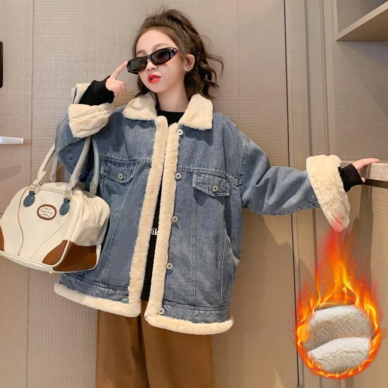 Джинсовая куртка для девочек, облегающая, зимняя, с плюшем и утолщением, корейская версия, детская куртка среднего и большого размера — купить товар онлайн с бесплатной доставкой до всему миру!