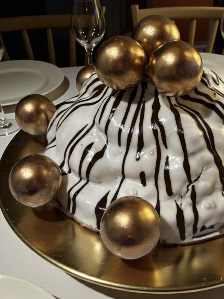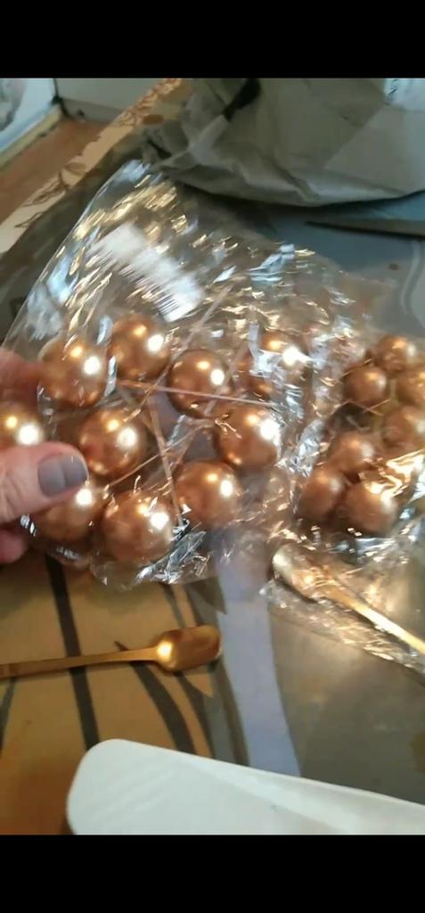Топперы для торта брала самые большие в размерной линейке, представленной продавцом. Визуально они мне понравились: крупные, блестящие шары. Если нет времени или желания самой печь и "заморачиваться" с декором торта, можно покупной торт ими украсить. Когда я читала описание, видела, что продавец указал, что они из пены. В общем, они из пенопласта, покрытые золотой краской. Во-первых, из чего сделана эта краска? Я не думаю, что это пищевой краситель. Во-вторых, она быстро слезает с шаров. Скорее всего, они одноразовые. Проще купить пластиковые топперы, которые, наверное, более экологичны и, по сути, вечные.