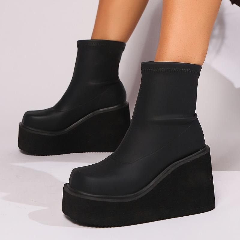Женские сапоги осень-зима модные короткие полусапожки на танкетке женские сексуальные черные сапоги с круглым носком эластичные сапоги готическая обувь для женщин — купить товар онлайн с бесплатной доставкой по всему миру!