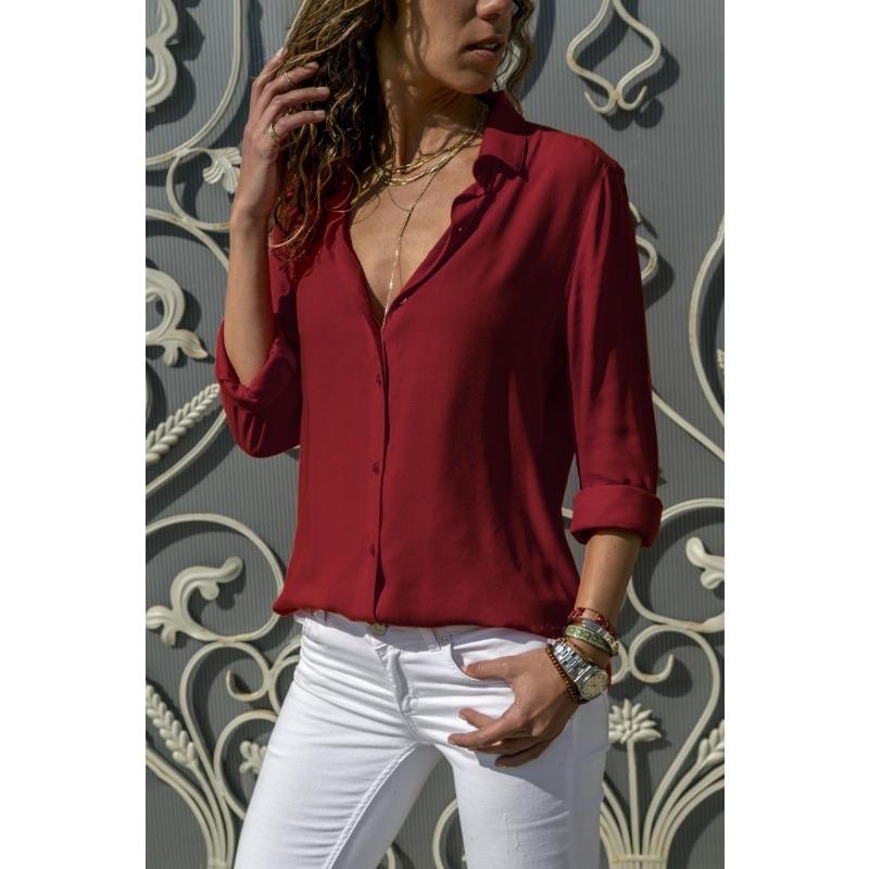 Осенняя женская однотонная рубашка с длинными рукавами, женский кардиган с лацканами, шифоновая рубашка с глубоким V-образным вырезом, шифоновая рубашка с пуговицами