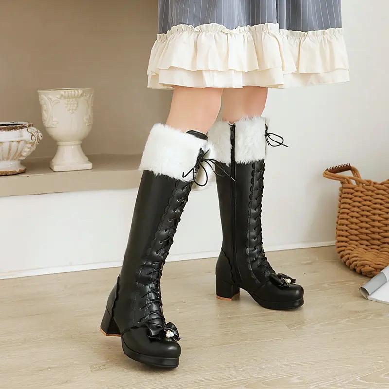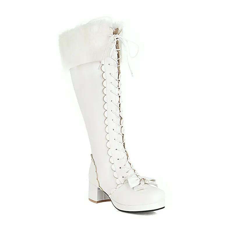 Большие размеры зимние женские свадебные туфли белые розовые меховые воротник банты оборки принцесса униформа Лолита косплей JK сапоги до колена