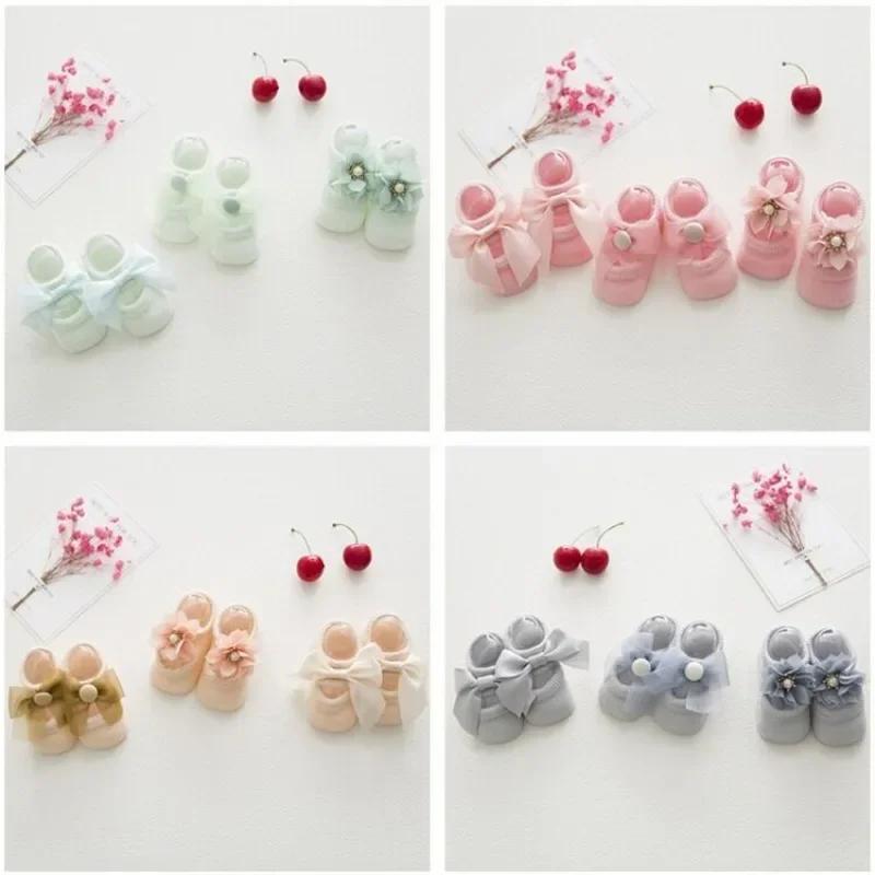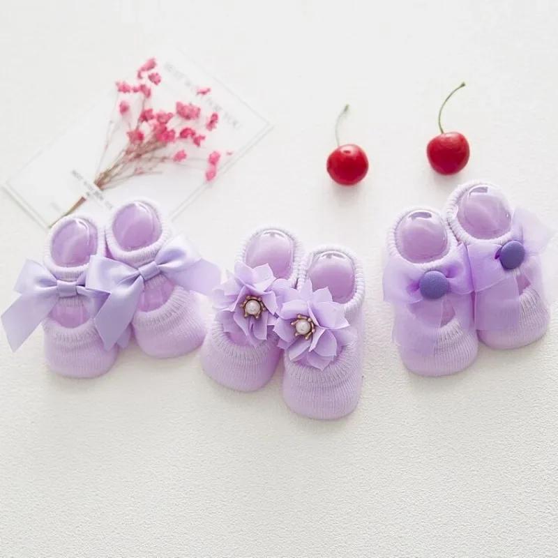 3 пары милых носков для маленьких девочек, милые кружевные короткие носки принцессы с бантом и цветочным принтом для маленьких девочек, летние хлопковые нескользящие носки для новорожденных