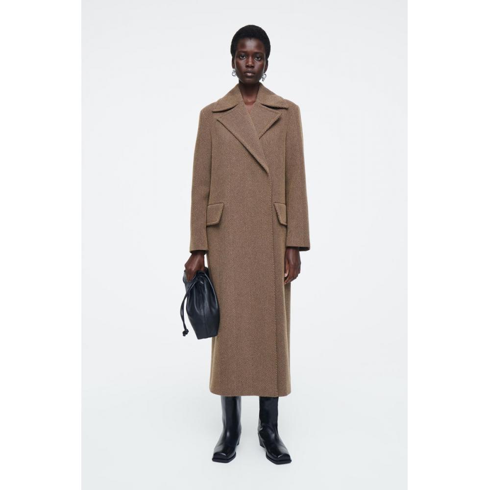 Пальто из шерсти COS с узором «в ёлочку» классического силуэта, выполненное из высококачественных материалов.. Это пальто, неподвластное времени, изготовлено из переработанной шерстяной ткани с узором «в елочку», известной своей прочностью и стилем.. Имеет заостренный лацкан, карманы с клапанами и потайную двубортную застежку, обеспечивающую удобную посадку поверх трикотажных изделий.. Классический крой обеспечивает достаточно места для надевания слоев, а в состав переработанной шерсти входит 62% шерсти, 28% полиэстера, 7% нейлона и 3% акрила.. Пальто также имеет подкладку из 100% вискозы и рекомендуется только химчистка.