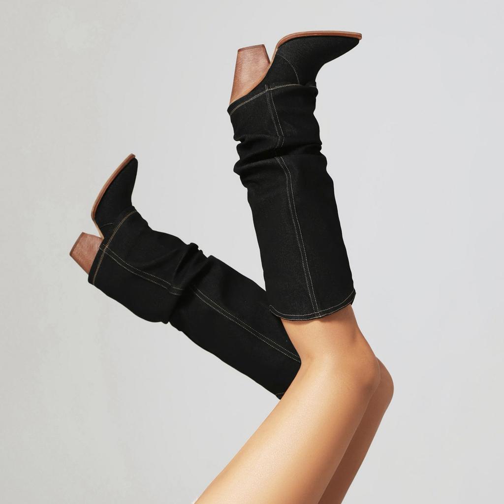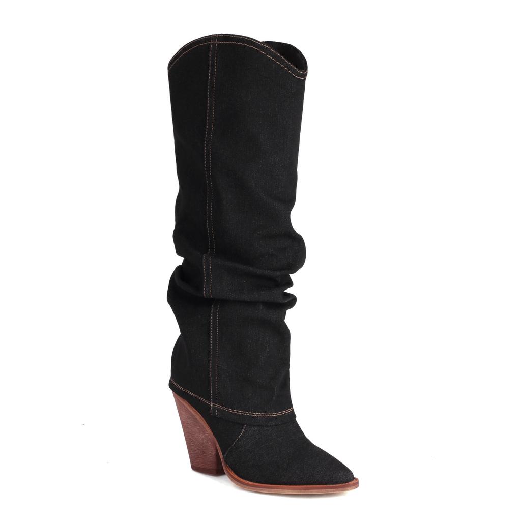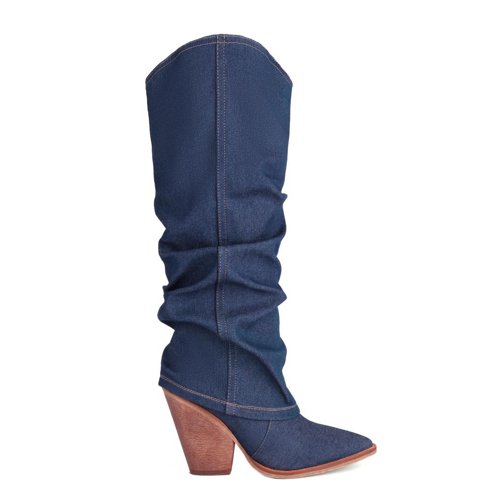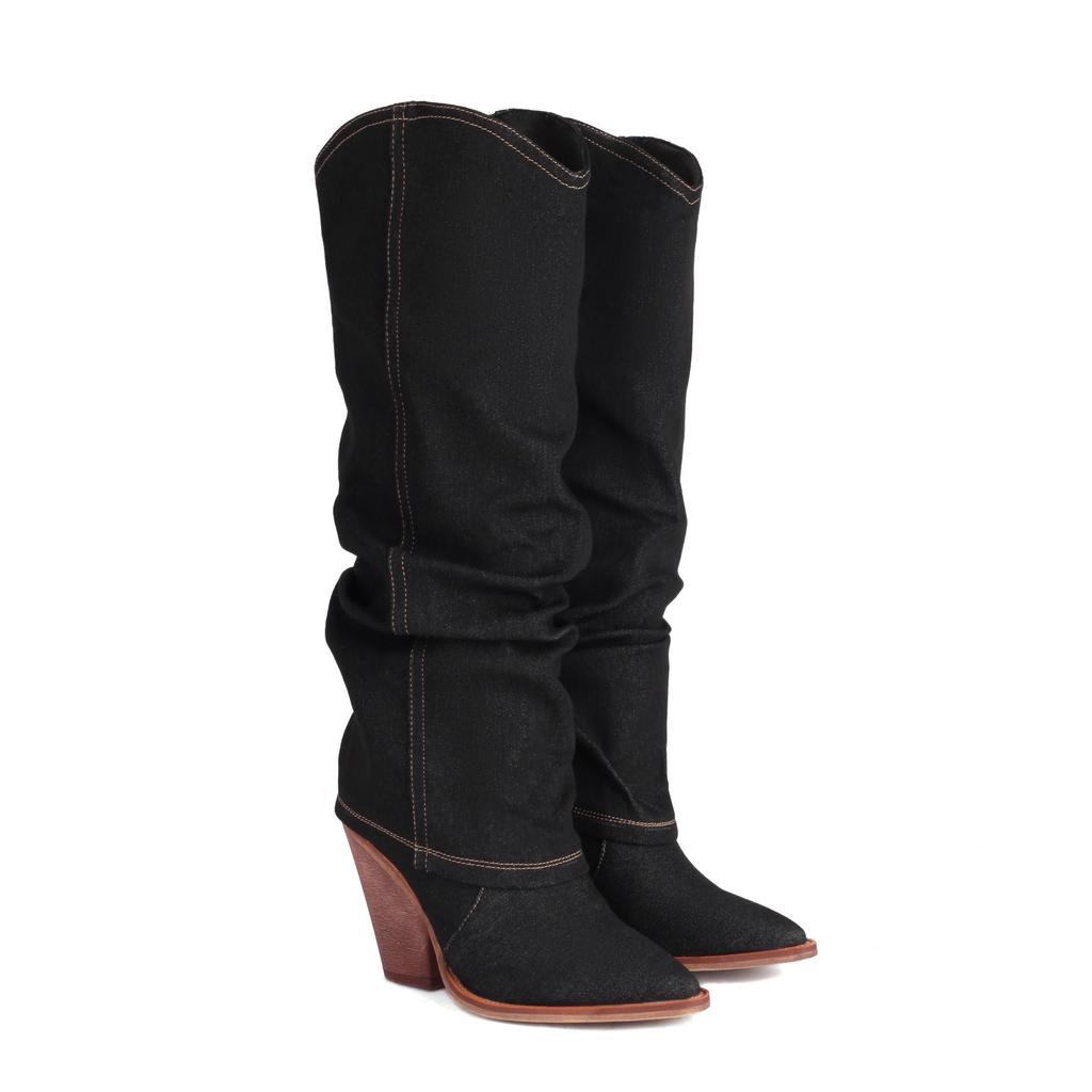 Krazing Pot Джинсовая обувь осень-зима на очень высоком каблуке с европейским дизайном, плиссированные украшения, сохраняющие тепло высокие сапоги