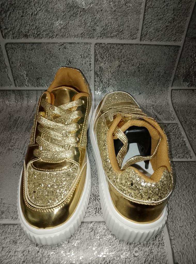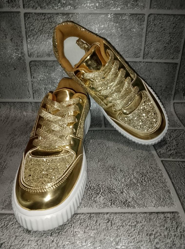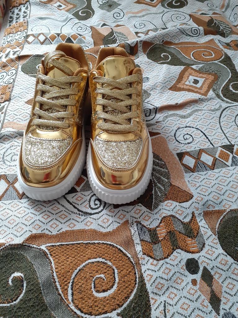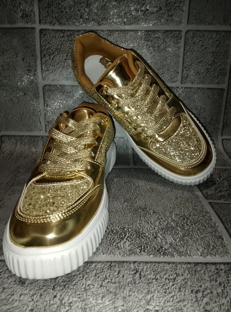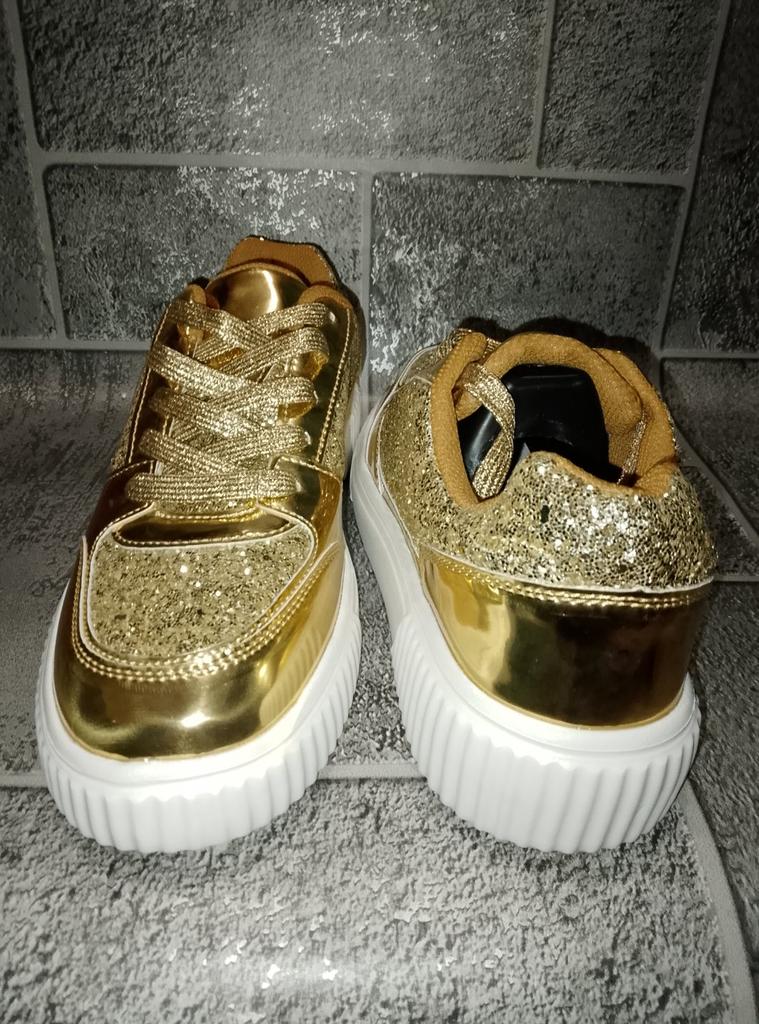 Друзья💞, золотые кроссовки от магазина "MCTIN Shoes". У продавца есть ещё и серебряные. Эко-кожа. Диско-глянец. Размер 42=26,5 см по стельке. Стелька съемная. Подошва 2,5-4 см. Резиновая. Стильный дизайн а-ля Майкл Джексон. Упаковка: зип-пакет и почтовый пакет. Доставка: 33 дня в Карагандинскую область. Активно рекомендую👍