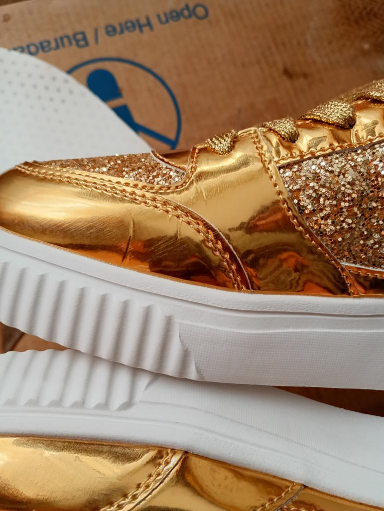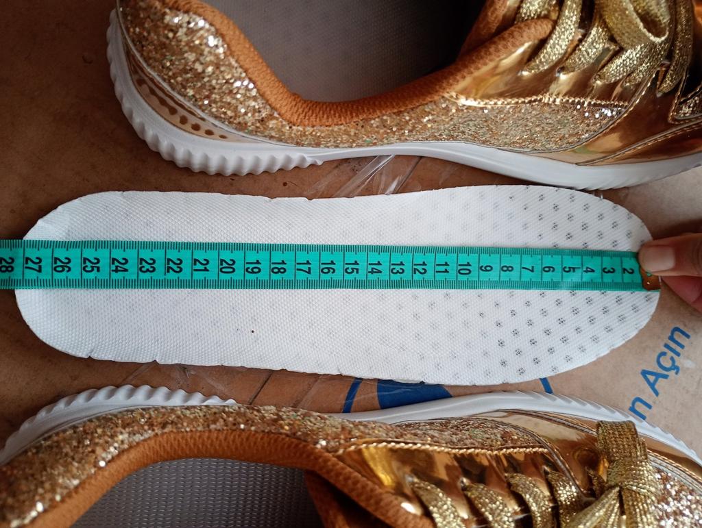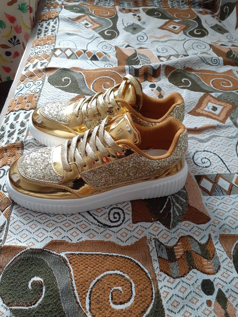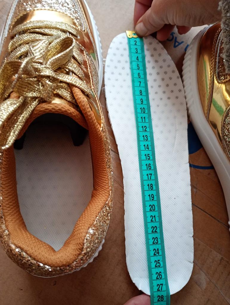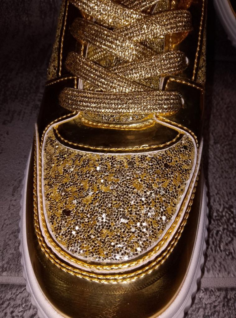 Друзья💞, золотые кроссовки от магазина "MCTIN Shoes". У продавца есть ещё и серебряные. Эко-кожа. Диско-глянец. Размер 42=26,5 см по стельке. Стелька съемная. Подошва 2,5-4 см. Резиновая. Стильный дизайн а-ля Майкл Джексон. Упаковка: зип-пакет и почтовый пакет. Доставка: 33 дня в Карагандинскую область. Активно рекомендую👍