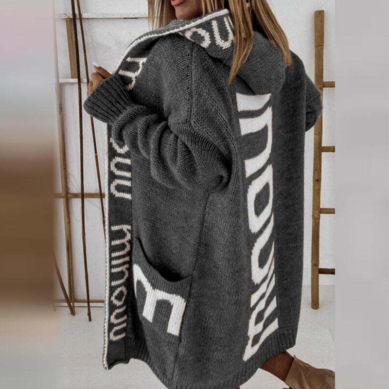 Длинный кардиган с капюшоном и монограммой, женский свитер, вязаное пальто