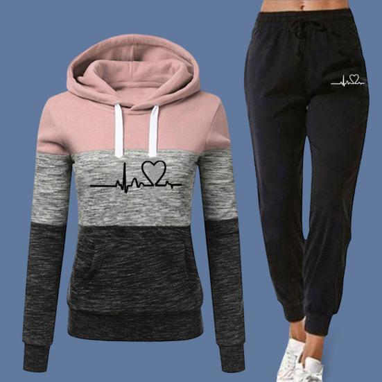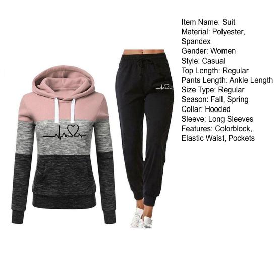 Этот женский спортивный костюм станет обязательным дополнением к вашему гардеробу.. Изготовленная из 95% полиэстера и 5% спандекса, эта высококачественная ткань дышит, не мнется и долговечна.. Толстовка с длинными рукавами и принтом в виде сердец в сочетании с спортивными штанами с цветными блоками создает повседневный и модный образ.. Свободный крой подчеркивает вашу фигуру и обеспечивает максимальный комфорт..