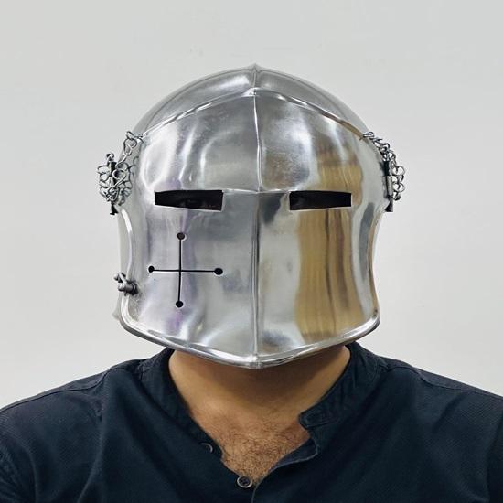 1. Аутентичный средневековый дизайн: Шлем-барбют с забралом тщательно изготовлен, чтобы отразить классический стиль средневековых европейских доспехов.. Отличительный вырез для лица и дизайн козырька обеспечивают как защиту, так и уникальную историческую эстетику, что делает его выдающимся экземпляром в любой коллекции.