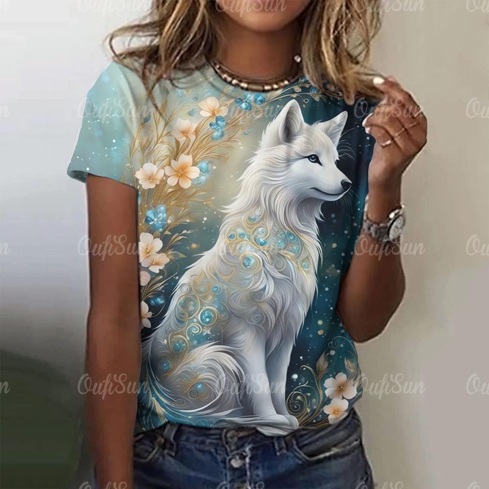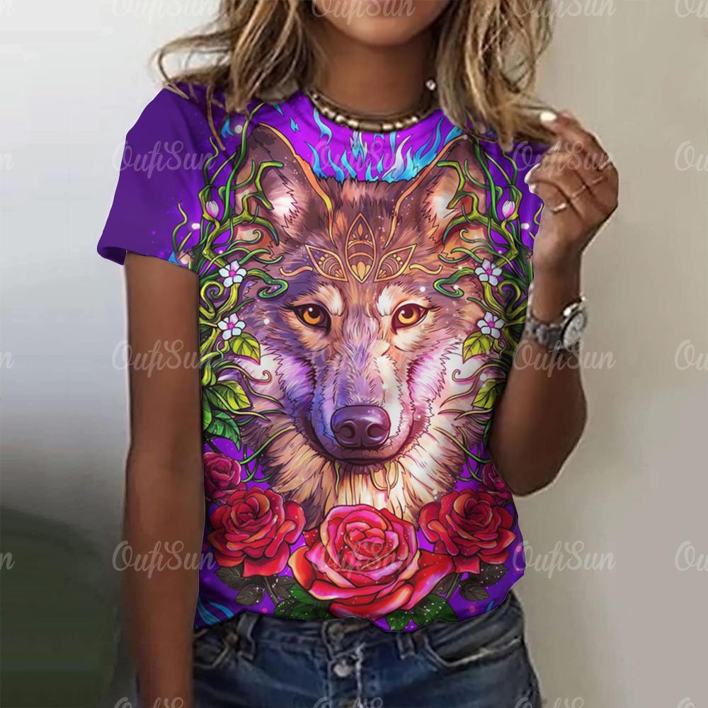 Футболка для женщин Футболки с принтом волка O-образным вырезом Свободная блузка с коротким рукавом Женская мода Топы с рисунком животных Уличная одежда в стиле Харадзюку