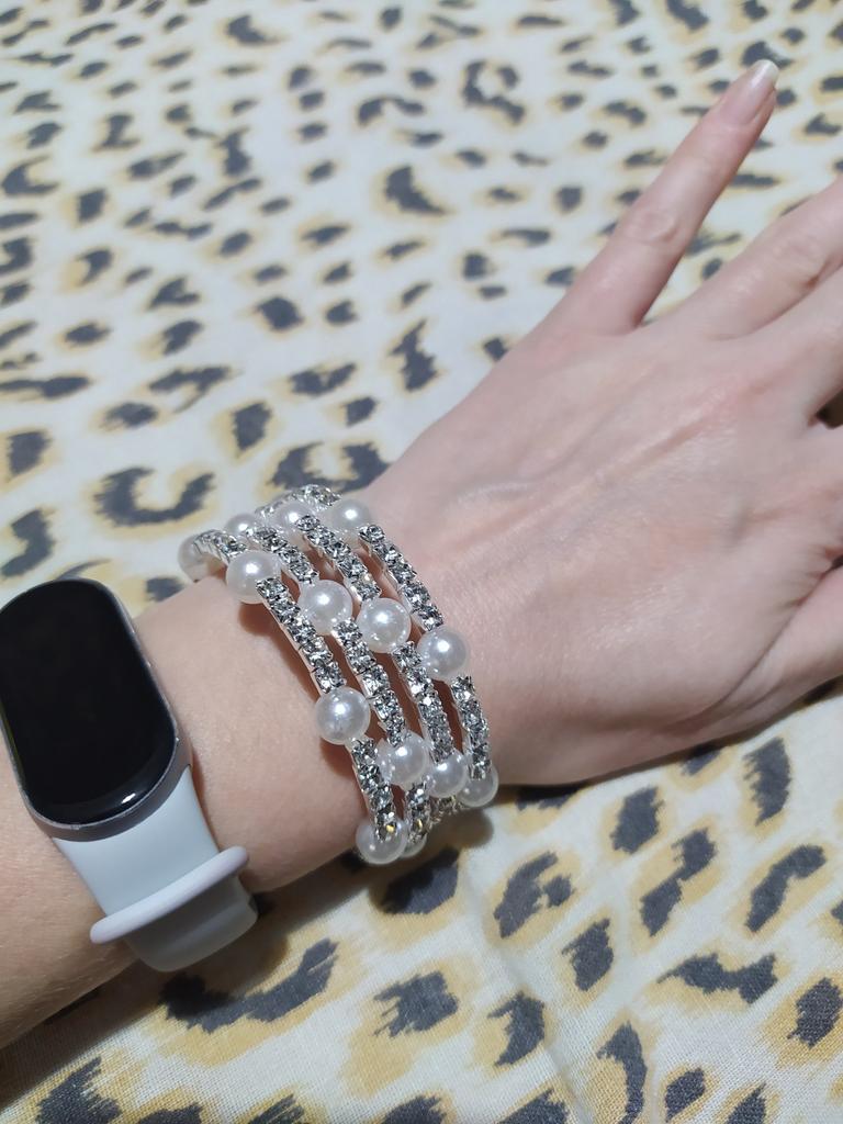 Элегантный пластиковый браслет - змейка. Гибкий, надевается по спирали, удобно. Выполнен из сверкающих страз и бусинок под жемчуг. Очень красиво выглядит. Понравился. Рекомендую.