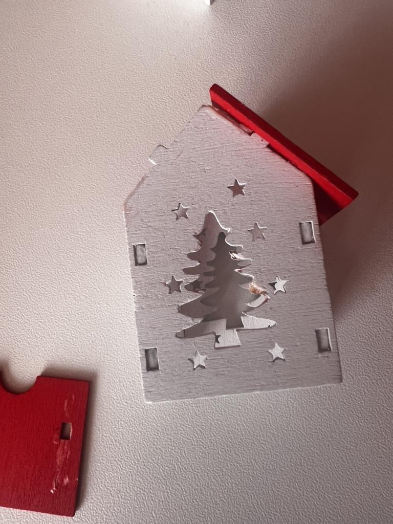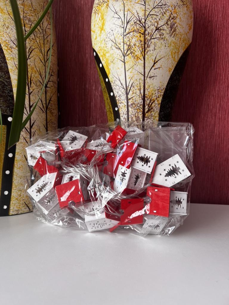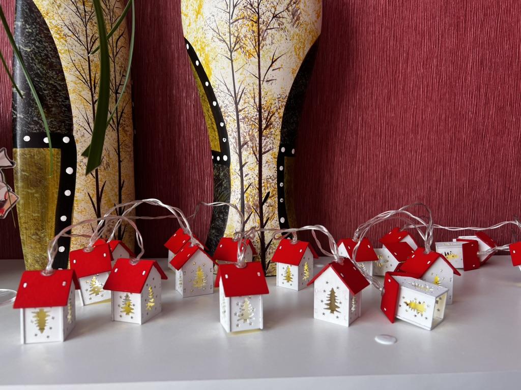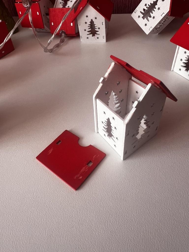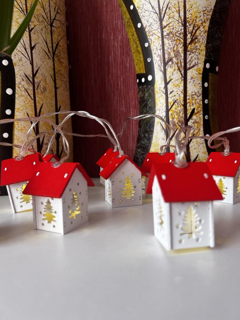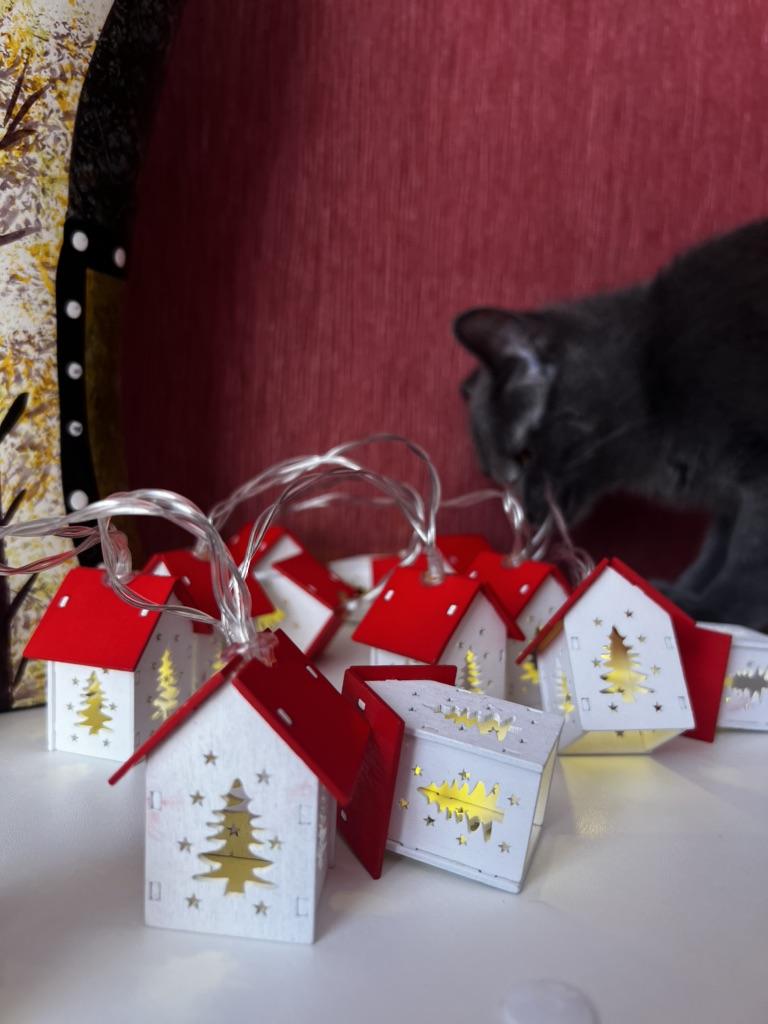 Рождественская гирлянда с домиками 🥰 Прекрасно разнообразит интерьер, если ваш подоконник пустует. Домики сделаны из дерева и покрашены краской. Кое-где на белом отпечатался красный оттенок. В других местах вырезанные на стенах елочки повредились во время доставки. Доставка, кстати, была в обычном почтовом пакете, без пупырки. У меня отвалилось несколько частей с крыши, но это легко исправить при помощи клея. Работает гирлянда от трех пальчиковых батареек. Правда кейс для них настолько тугой, что я сломала его в попытках открыть 🫣 Есть два режима: просто ровный свет и мигание. За свою цену очень хорошо!