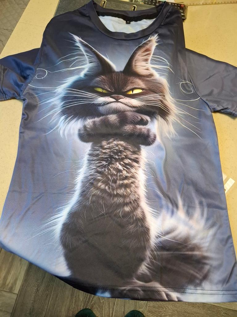 Весёлую футболку заказывала сыну. Котейка весёлый. Смотрится хорошо. Размер 4XL подошёл на наш 54. Свободенько. Посмотрим что будет дальше после стирки. Пришла в сборной посылочке. Спасибо, упаковано хорошо. Спасибо большое создателю продавцу и джумику.