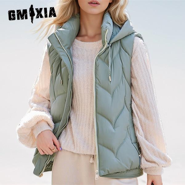 GMXIA Женские винтажные повседневные однотонные принтованные осенне-зимние безрукавные куртки с капюшоном и пальто