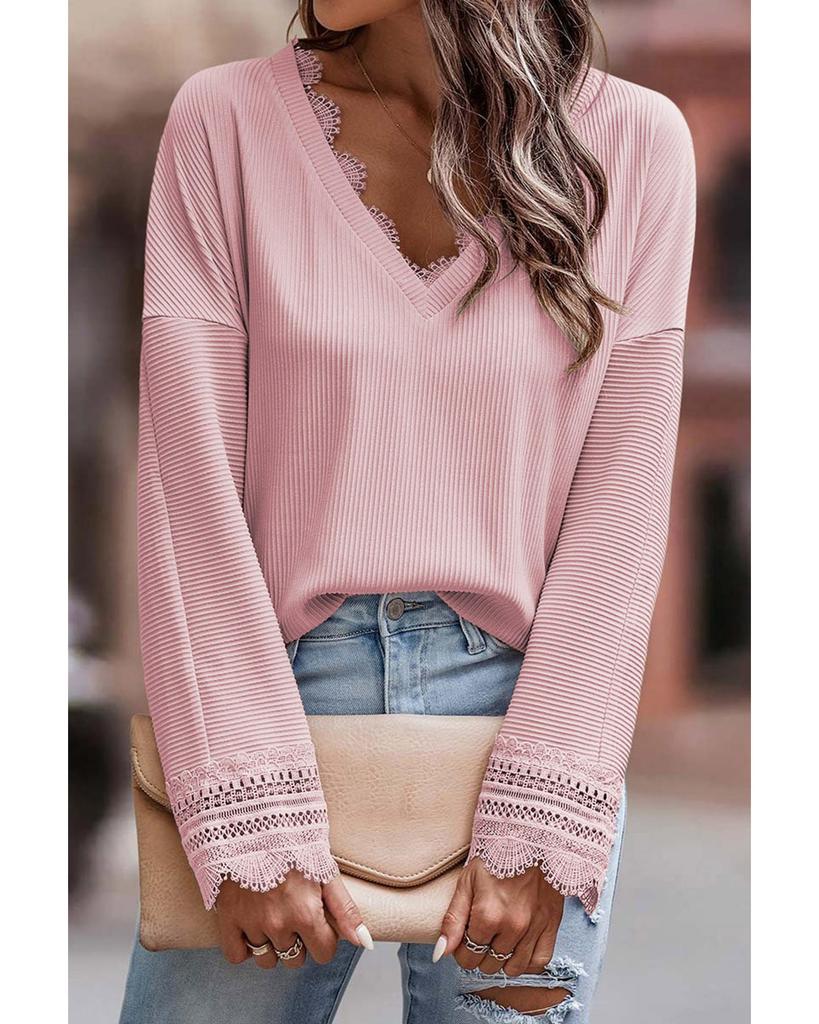 Azura Exchange Топ с длинными рукавами и V-образным вырезом, отделкой кружевом в рубчик