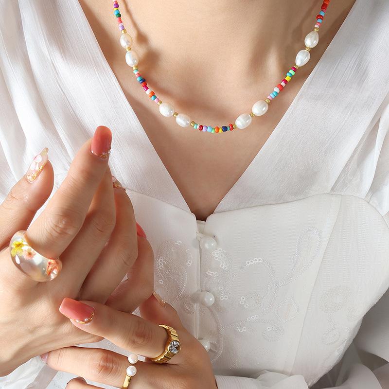 Цветные стеклянные бусины, натуральный пресноводный жемчуг, ожерелье из титановой стали, модный тренд в стиле бохо