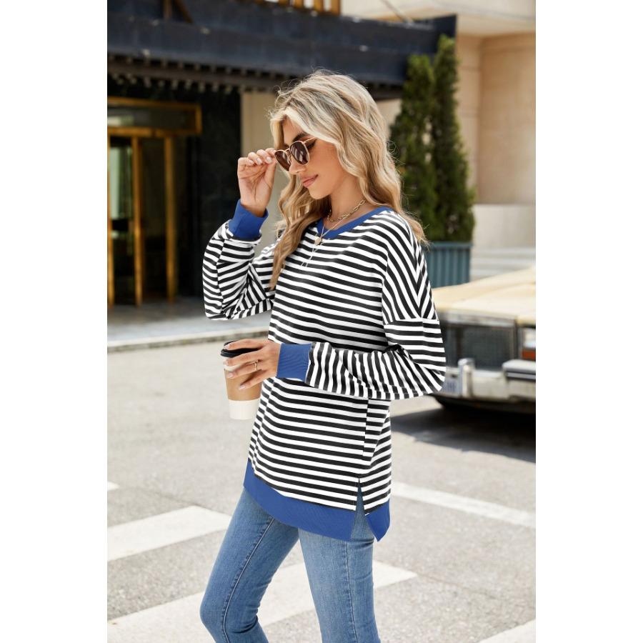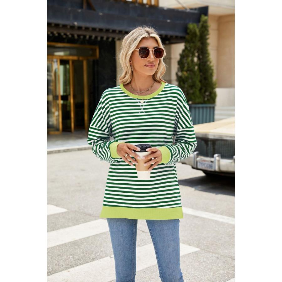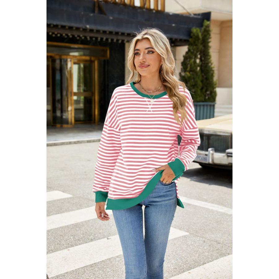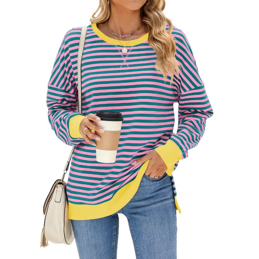 Осень-зима, женский контрастный цветной пуловер с длинными рукавами, круглым вырезом, разрезом, толстовки, повседневная свободная полосатая толстовка больших размеров для женщин