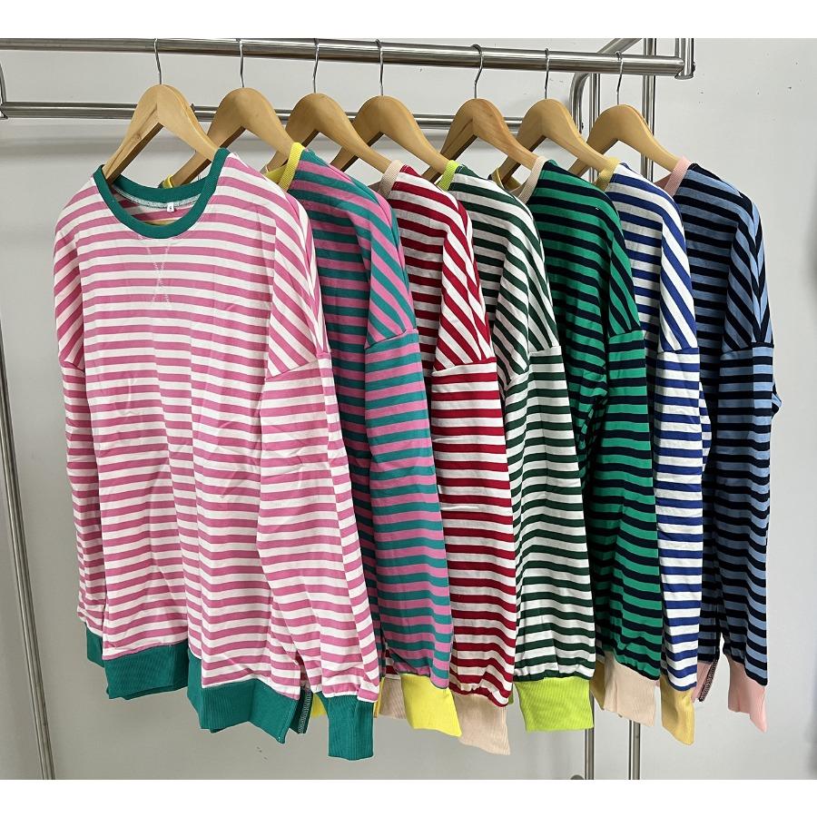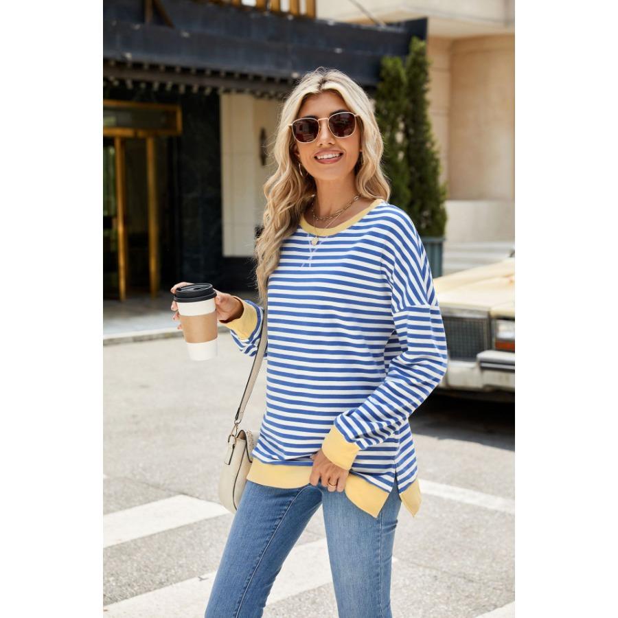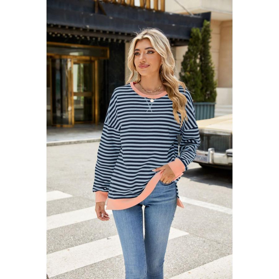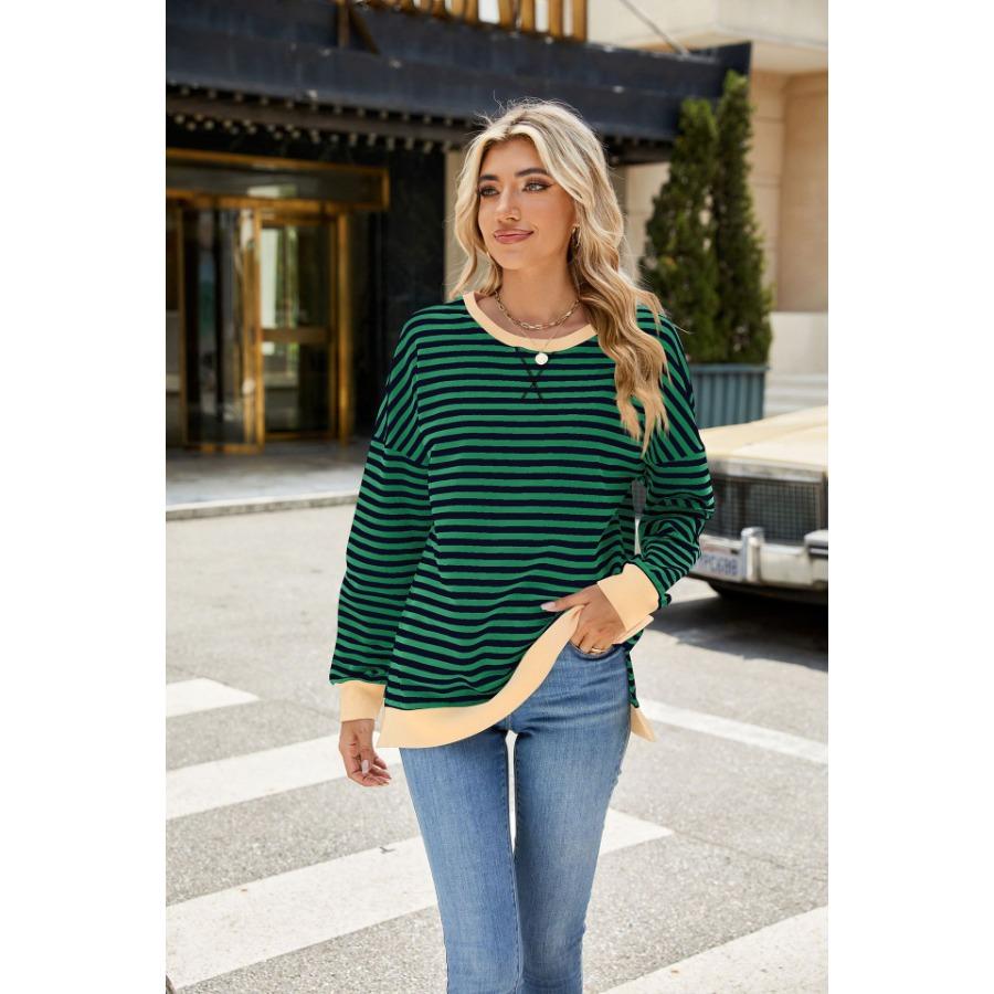 Осень-зима, женский контрастный цветной пуловер с длинными рукавами, круглым вырезом, разрезом, толстовки, повседневная свободная полосатая толстовка больших размеров для женщин