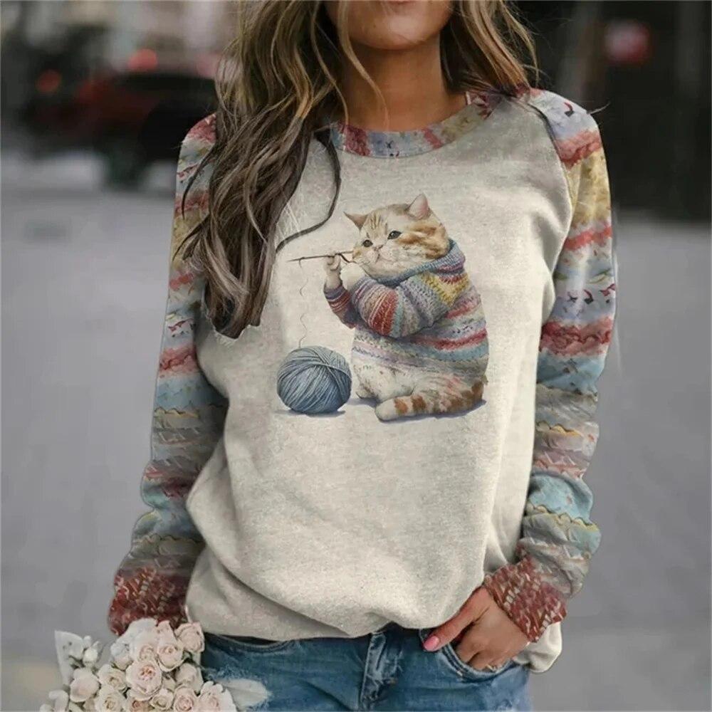 Осенняя женская модная футболка с круглым вырезом и длинным рукавом, свободная одежда, теплая футболка с принтом кота для девочек, уличная — купить товар онлайн с бесплатной доставкой по всему миру!