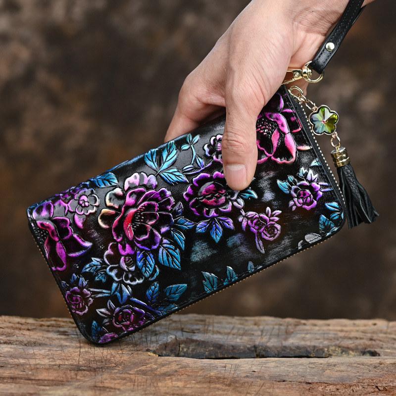 Винтажный дизайн, цветочные тисненые сумки для женщин, натуральная кожа, длинные кошельки, модные женские кошельки на молнии, держатели для карт GZW
