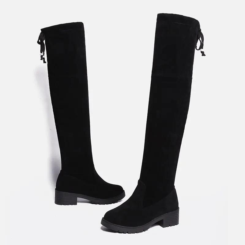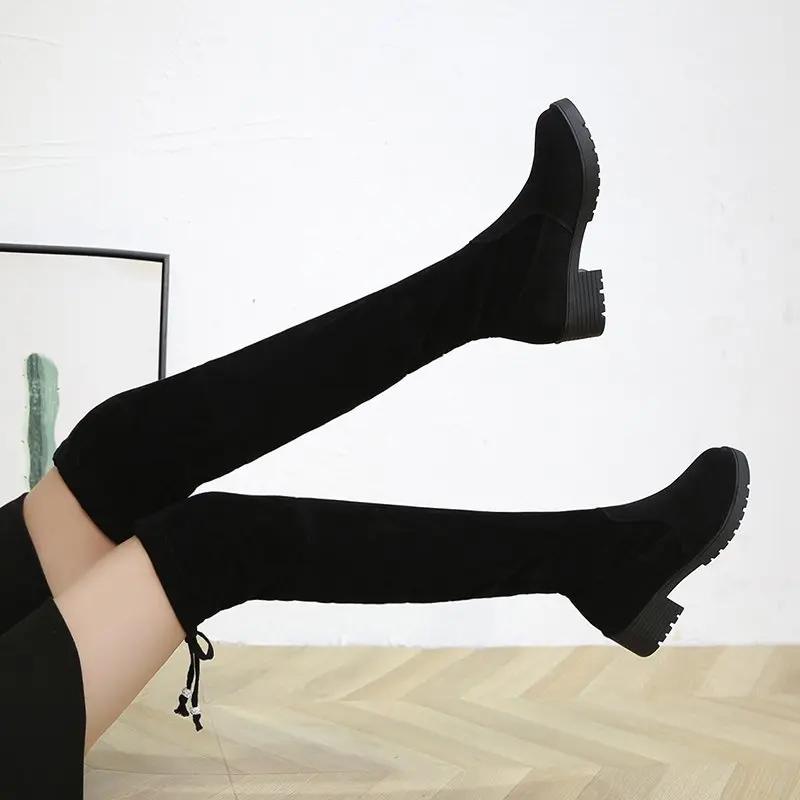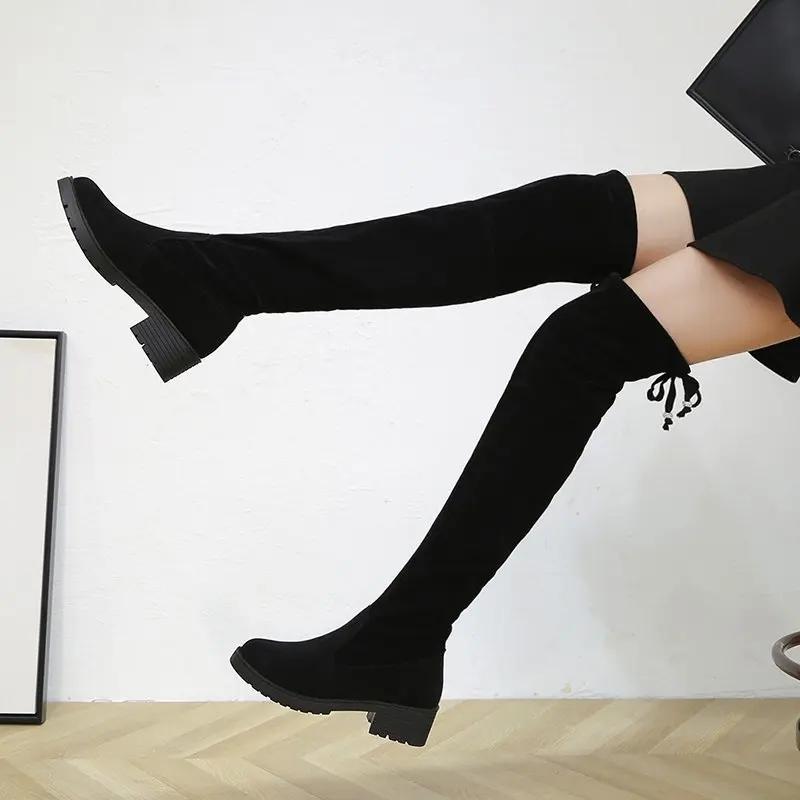 Весна и осень Новые модные тонкие толстые высокие каблуки с флокированными вставками женские сапоги выше колена современные эластичные зимние внутренние сапоги