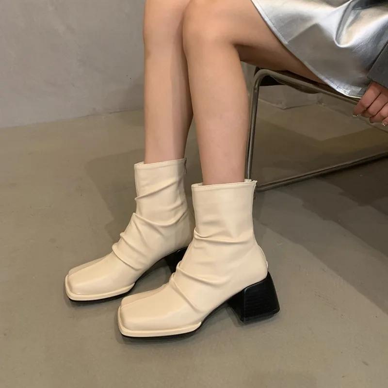 Осенние и зимние женские сапоги Модные плиссированные сапоги с квадратным носком Женские короткие сапоги Western Zapatos De Mujer