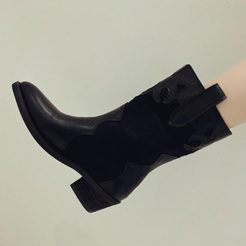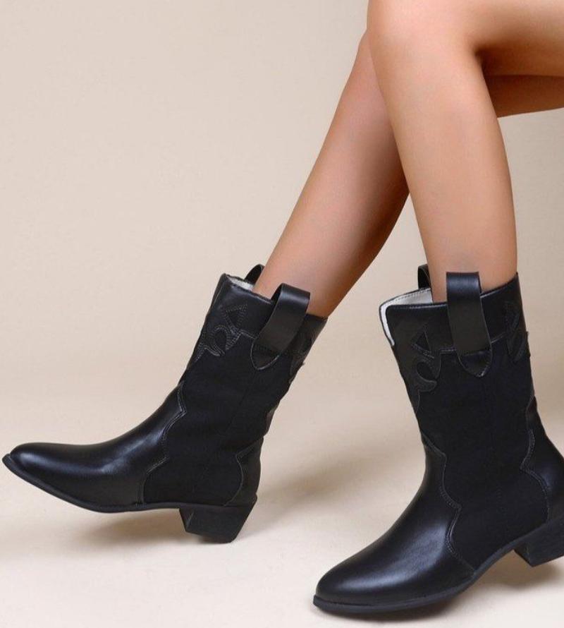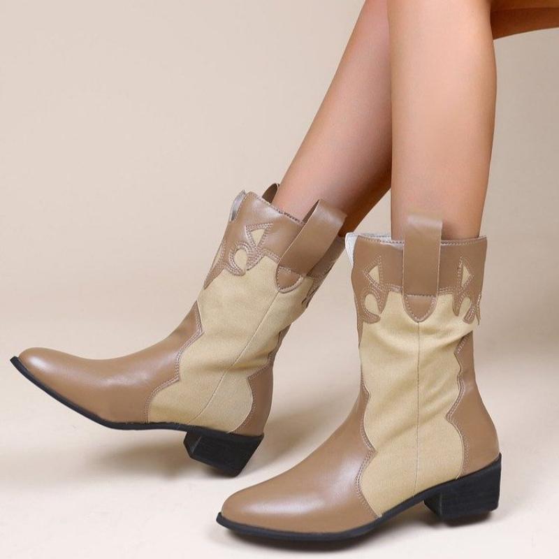Новые ковбойские сапоги в стиле вестерн для женщин, женские туфли с острым носком, тисненые замшевые туфли, женские сапоги до середины голени на толстом каблуке