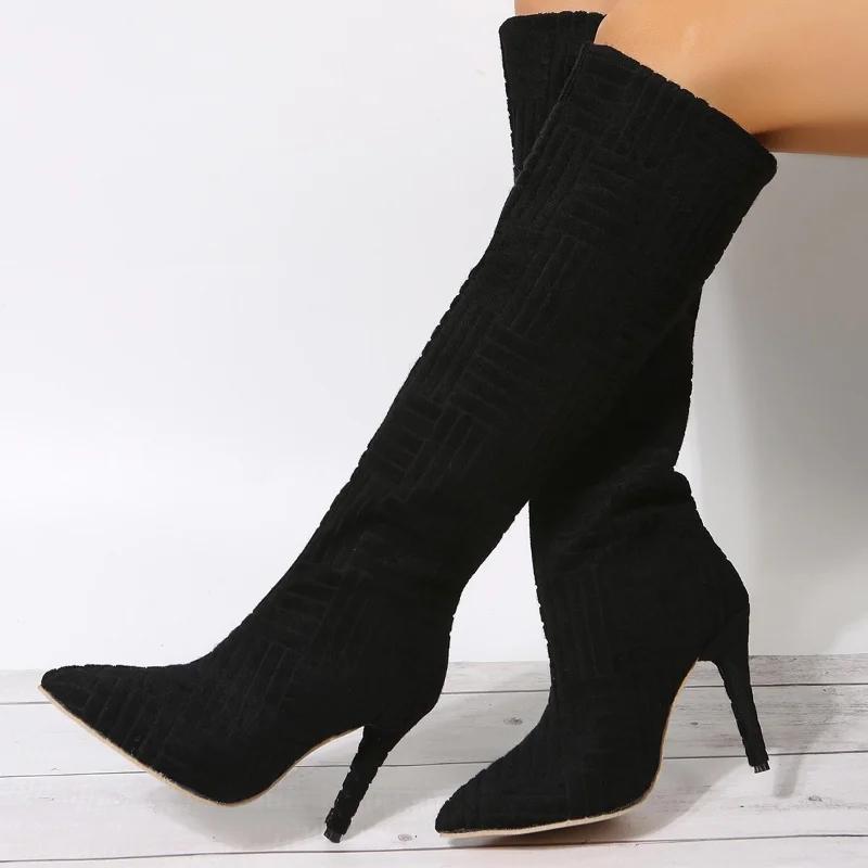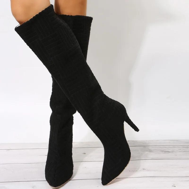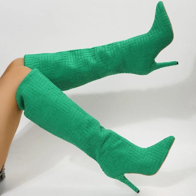 Женские сапоги на высоком каблуке, высокие зеленые туфли до колена, войлочные сапоги для мокасин, повседневные, элегантные, сексуальные, пушистые, для танцев на шесте, для стриптиза, большие размеры