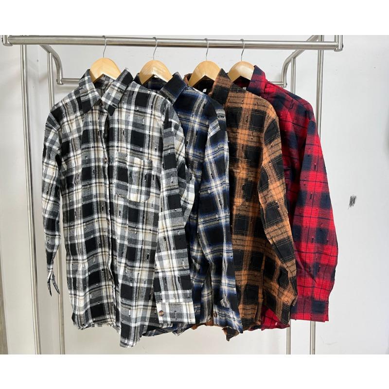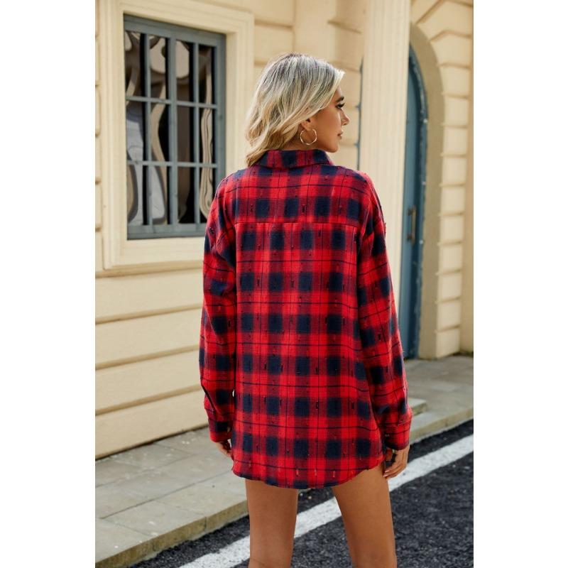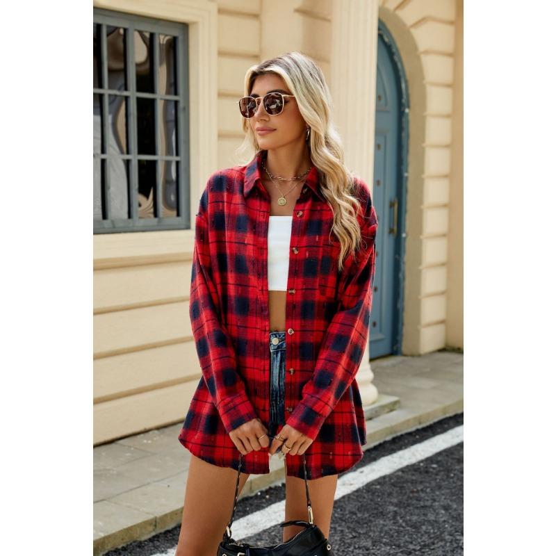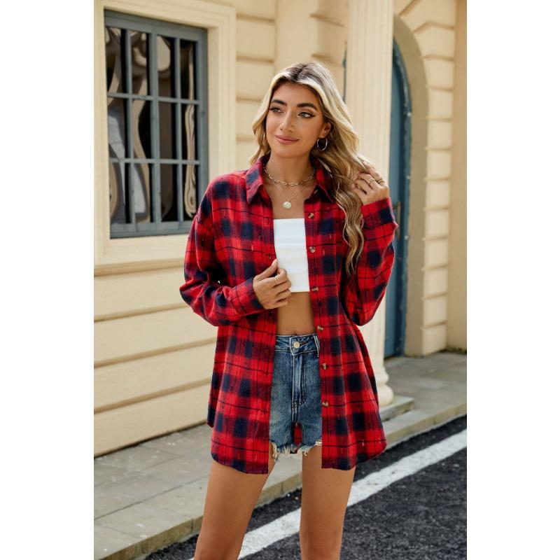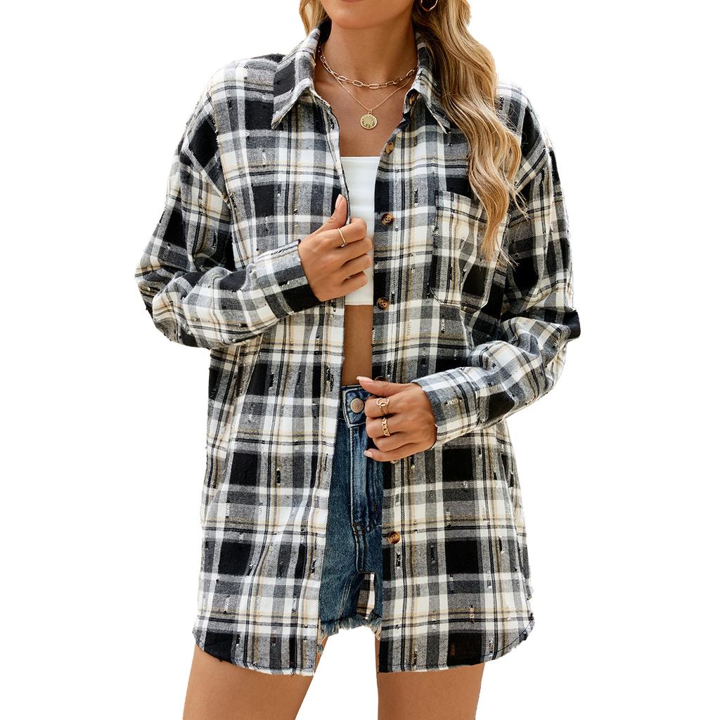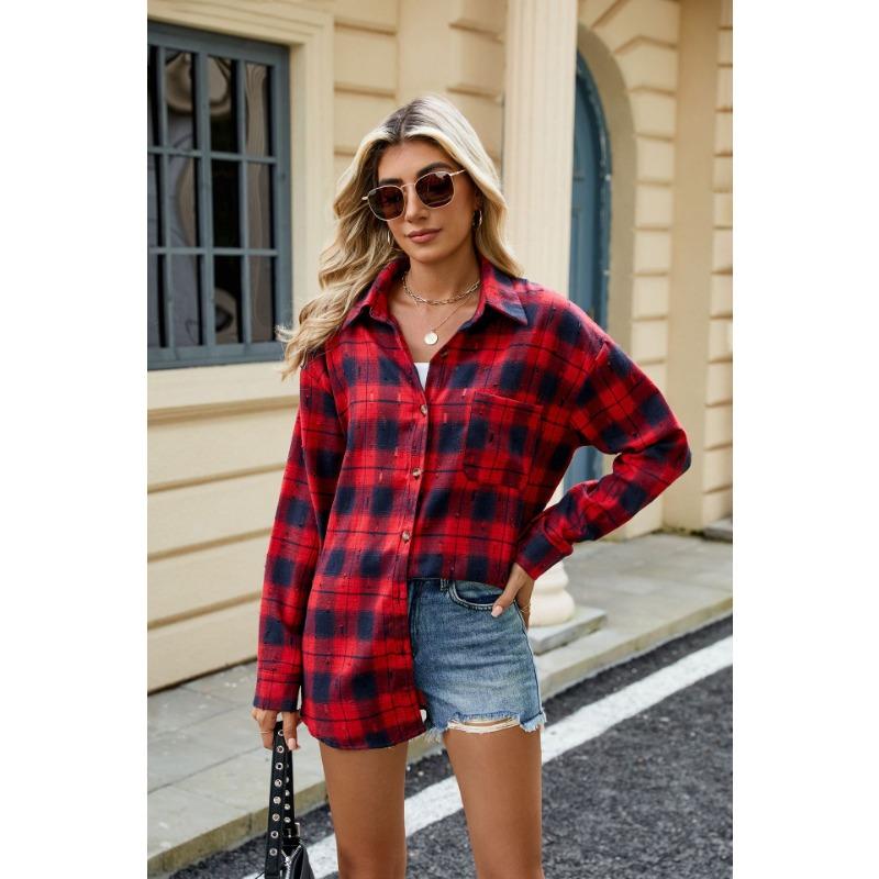 Весенне-осенняя женская ретро-вязаная крючком рубашка с длинным рукавом и свободными лацканами в клетку