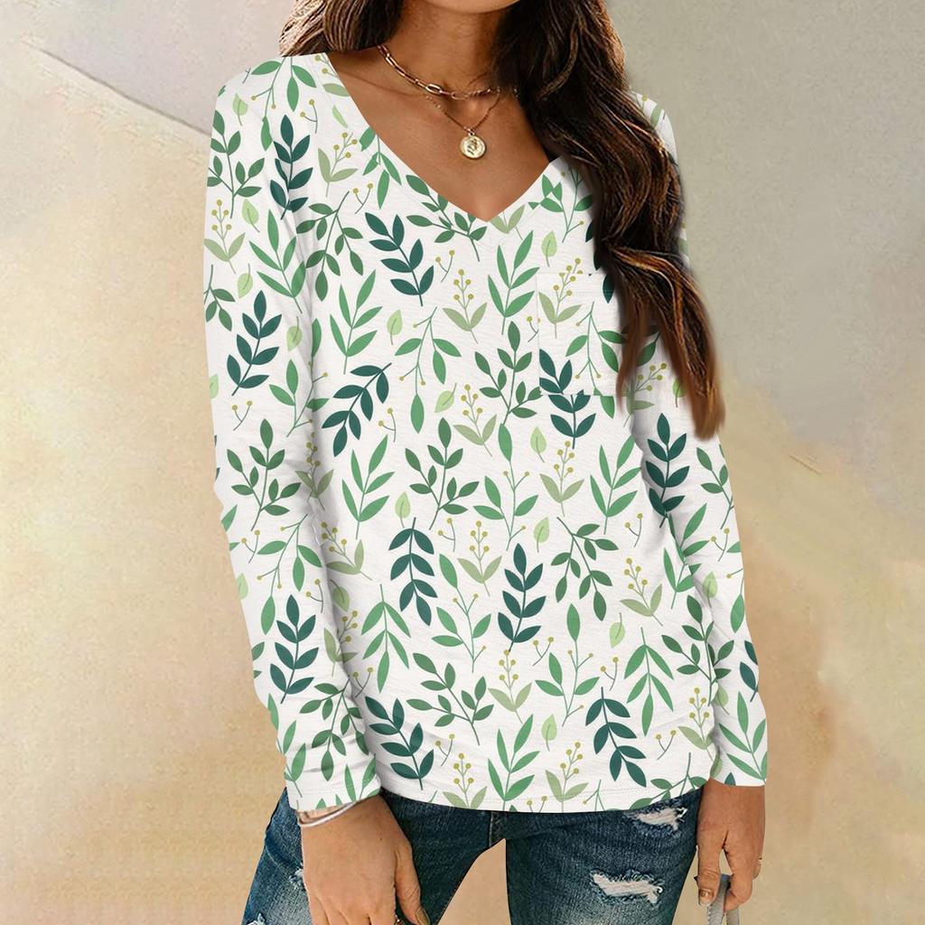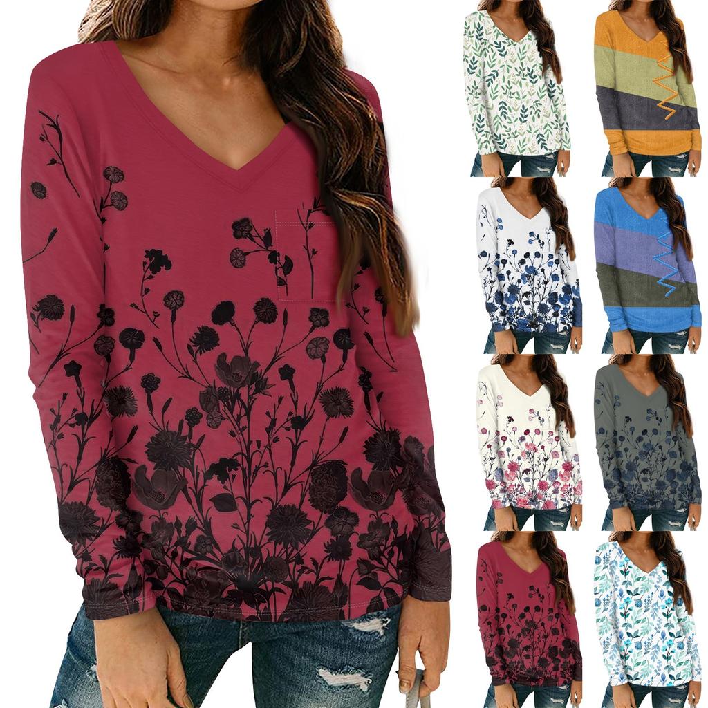 Женская мода повседневная блузка с длинным рукавом и цветочным принтом, V-образным вырезом и карманами