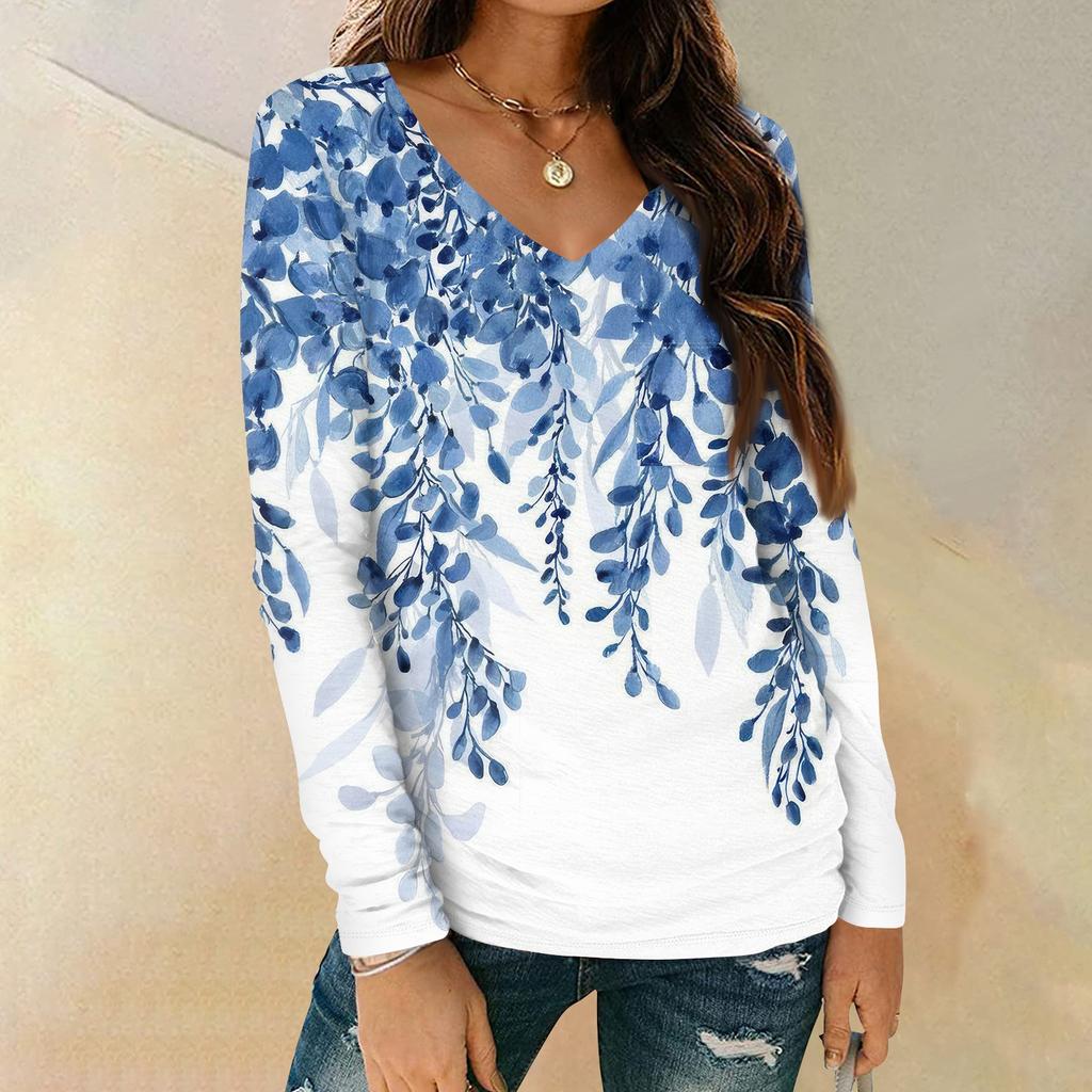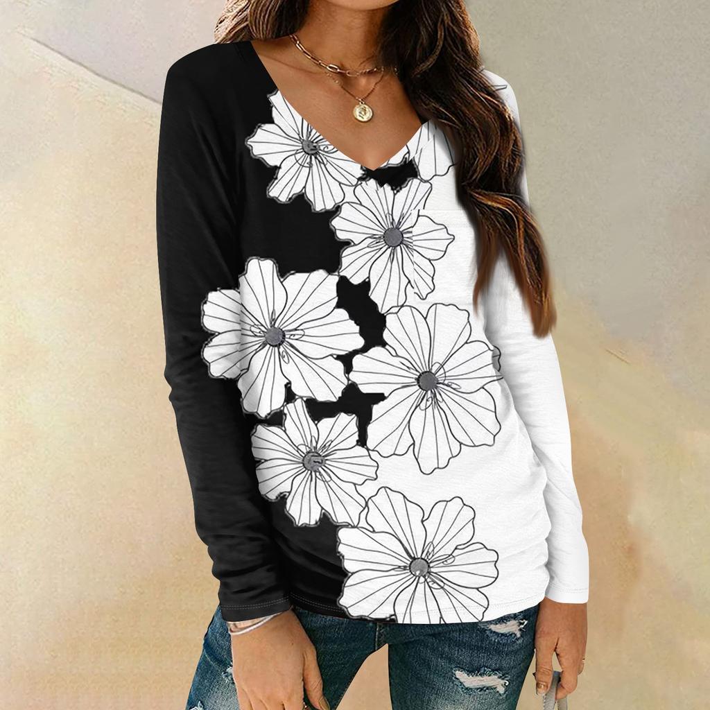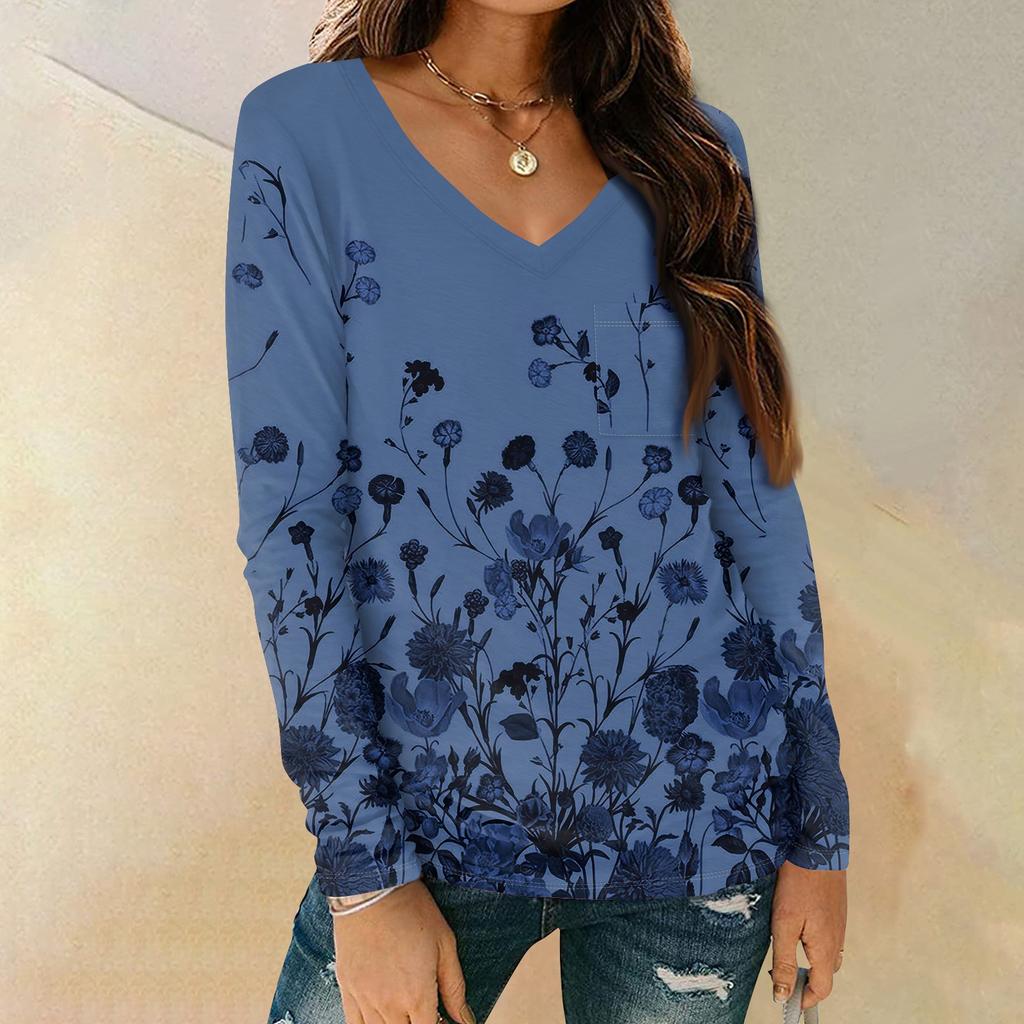 Женская мода повседневная блузка с длинным рукавом и цветочным принтом, V-образным вырезом и карманами