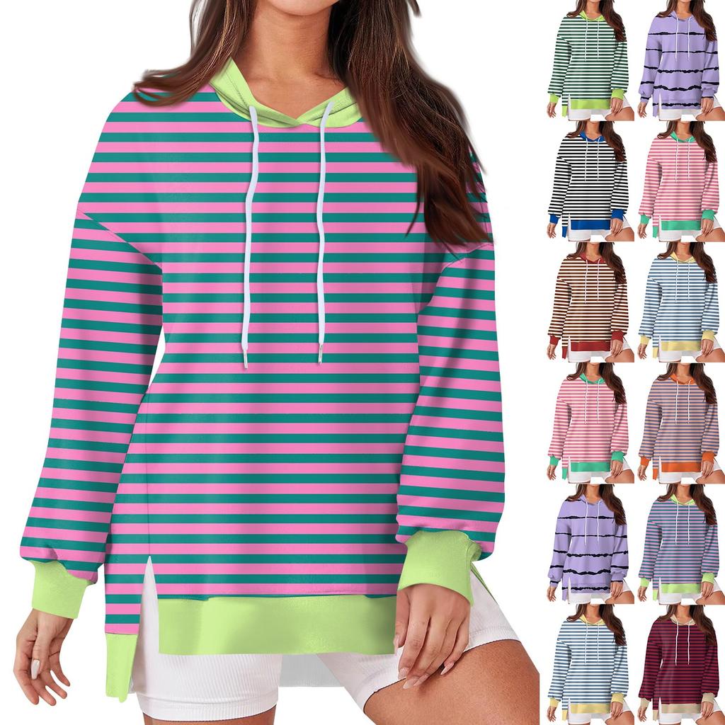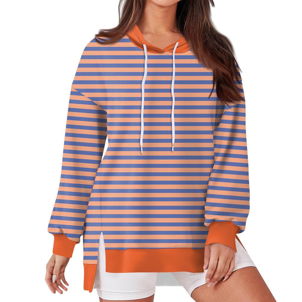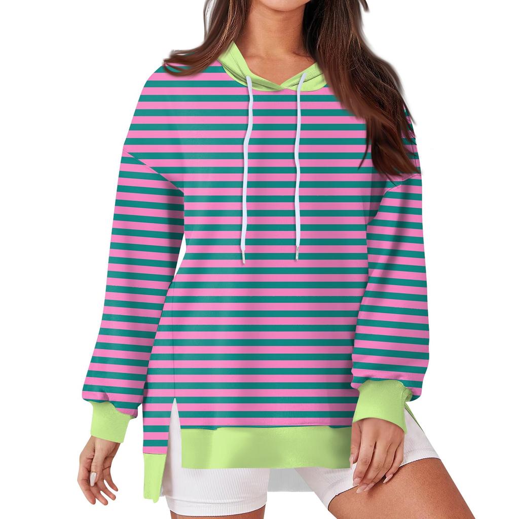 Женская модная повседневная толстовка с капюшоном с длинными рукавами и завязками, полосатая лоскутная принтованная свободная толстовка с разрезом