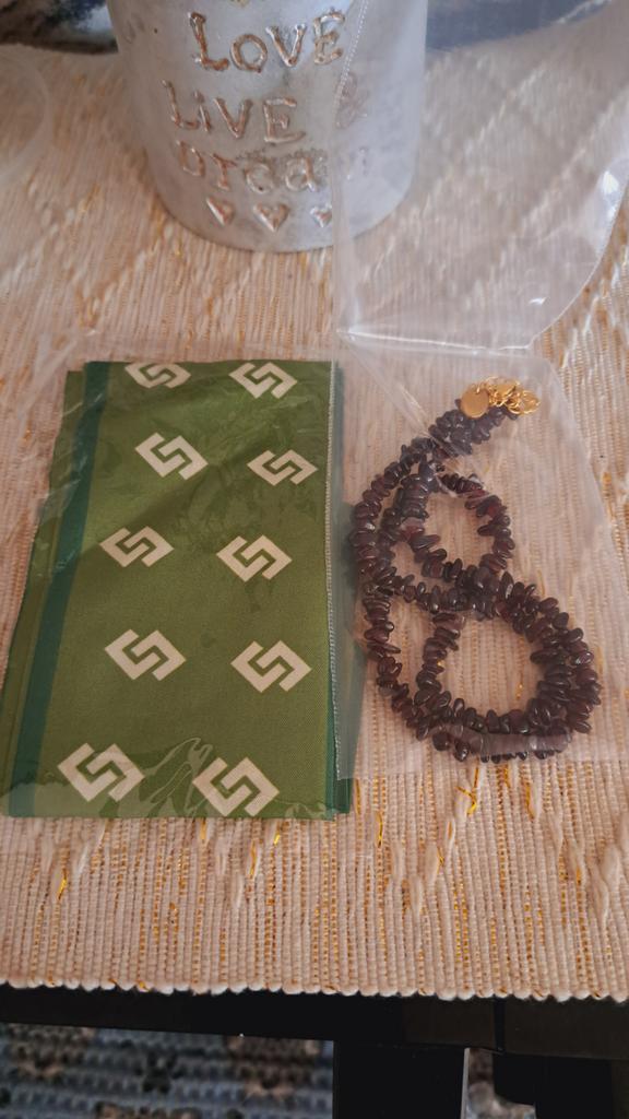 Красивое натуральное гранатовое ожерелье. Заказала отдельно браслет и получился комплект. В подарок положили повязку для волос. Спасибо.