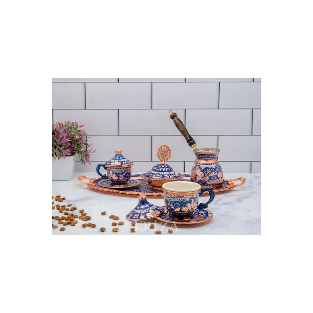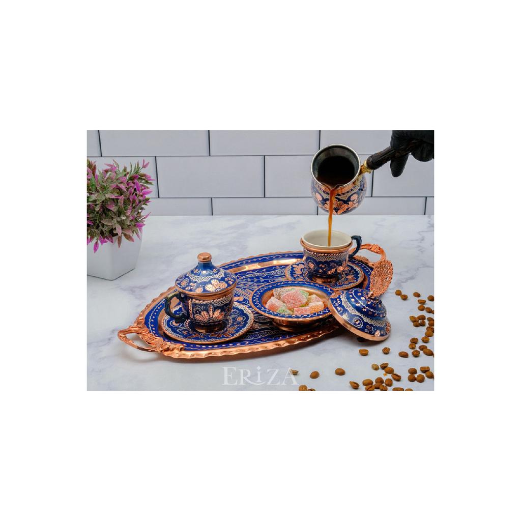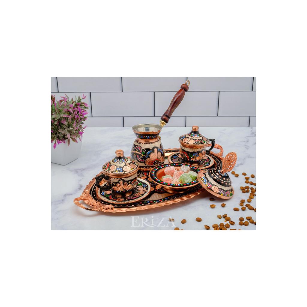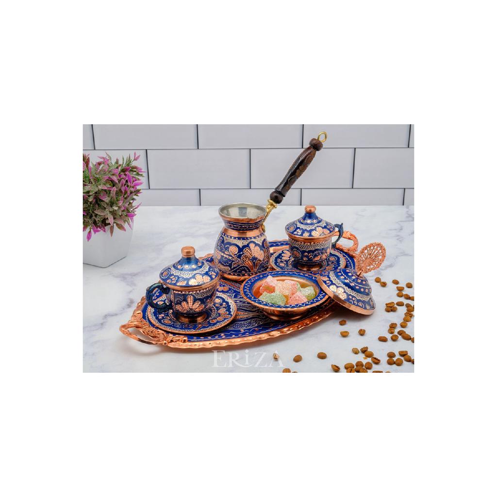 Набор медных чашек с вышивкой на 2 человека, комплект (поднос, подставка для рахат-лукума, 2 чашки, кофейник на 2 персоны)