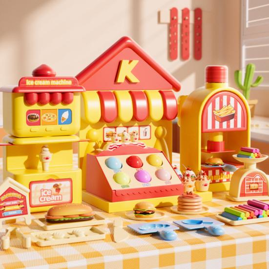Приключение в магазине бургеров своими руками: Дайте волю творческой игре с полным набором из 57 предметов, включая глиняную машину, знак, весы, тарелку, различные инструменты, дольки фруктов, формочки и наклейки.. Дети могут создавать собственные сцены в бургерной и исследовать бесконечные возможности.