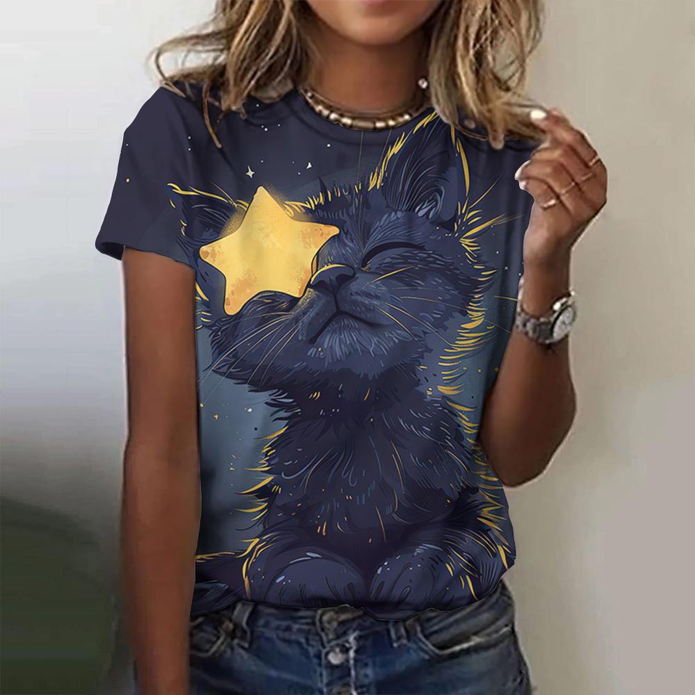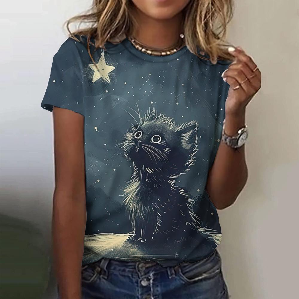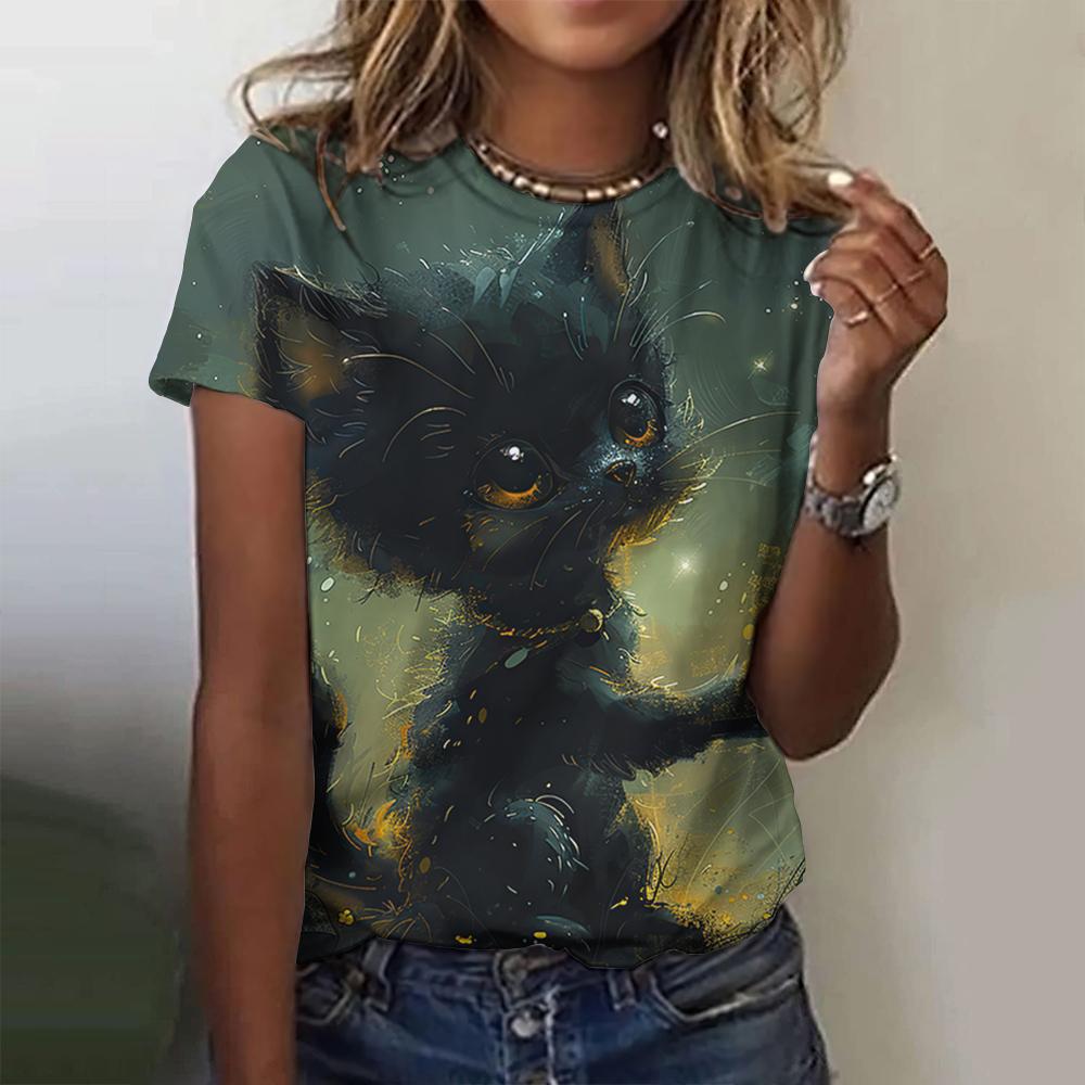Летняя женская футболка с рисунком в виде черной кошки, модная повседневная свободная футболка с круглым вырезом и коротким рукавом