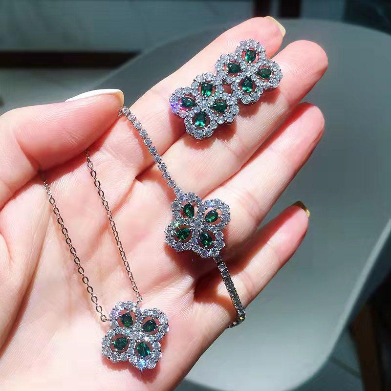 Комплект украшений «Темперамент» Симуляция зеленого сокровища Кристалл Ожерелье «Темперамент» Мода Цвет сокровища Браслет Серьги-гвоздики из циркона