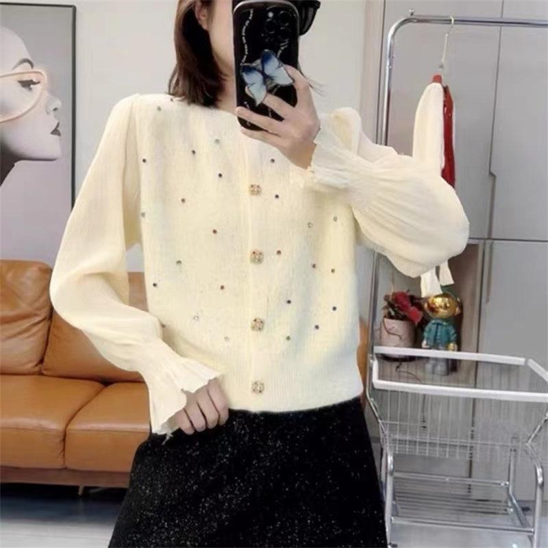 Весна и осень Новый кардиган с рукавами из пряжи и круглым вырезом Корейский свитер с мягким ветром Тяжелая промышленная вязаная бисером женская верхняя часть