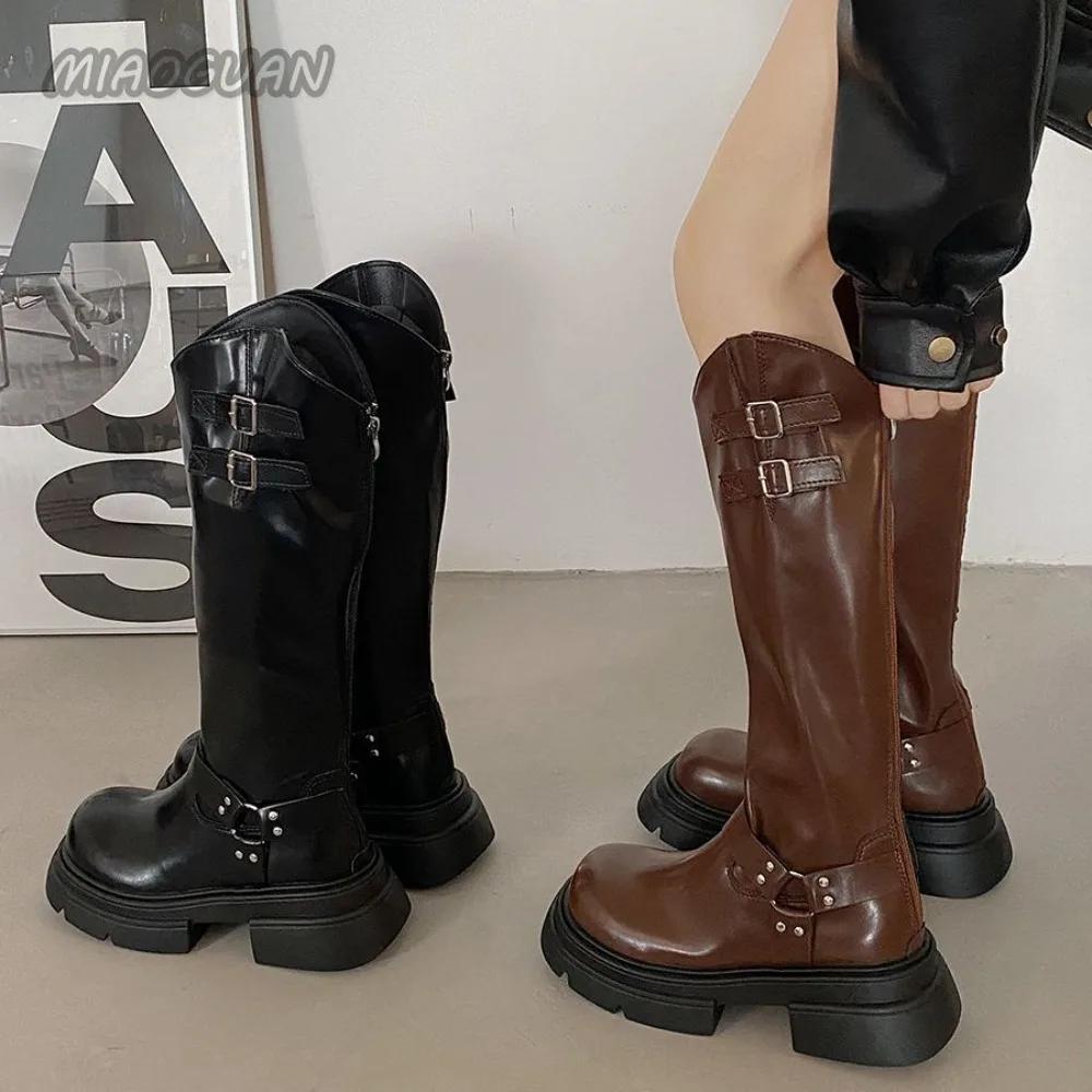 Длинные сапоги для женщин с толстой подошвой и V-образным вырезом в стиле ретро, черные, коричневые, с пряжкой на ремне и круглым носком, высокие сапоги до колена, увеличивающие рост, рыцарские боты