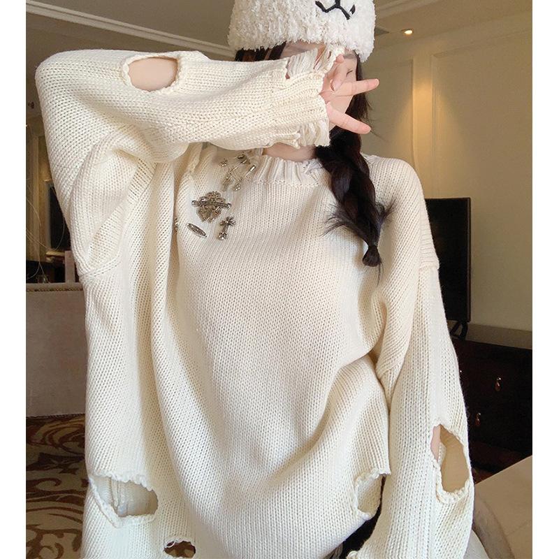 Осенне-зимний женский свитер, дизайн Sense of Niche, шикарный пуловер, свитер с рваными отверстиями, украшение на булавке, ленивый ветер, трикотаж
