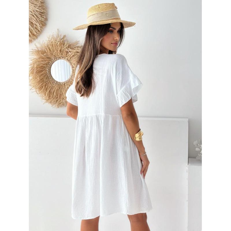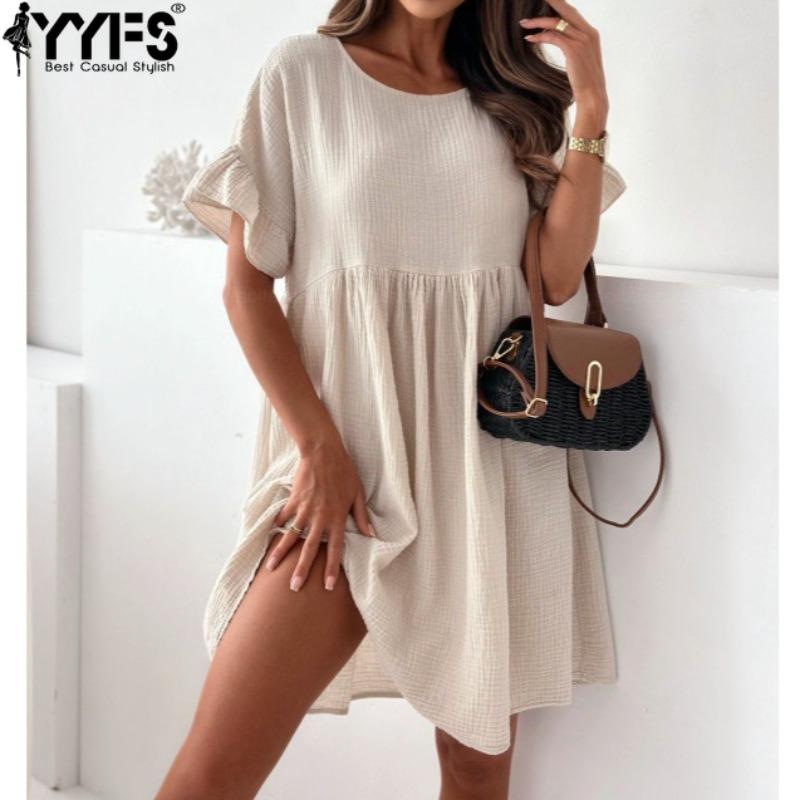 YYFS Женская мода лето весна однотонный принт с коротким рукавом и круглым вырезом свободная талия повседневные платья