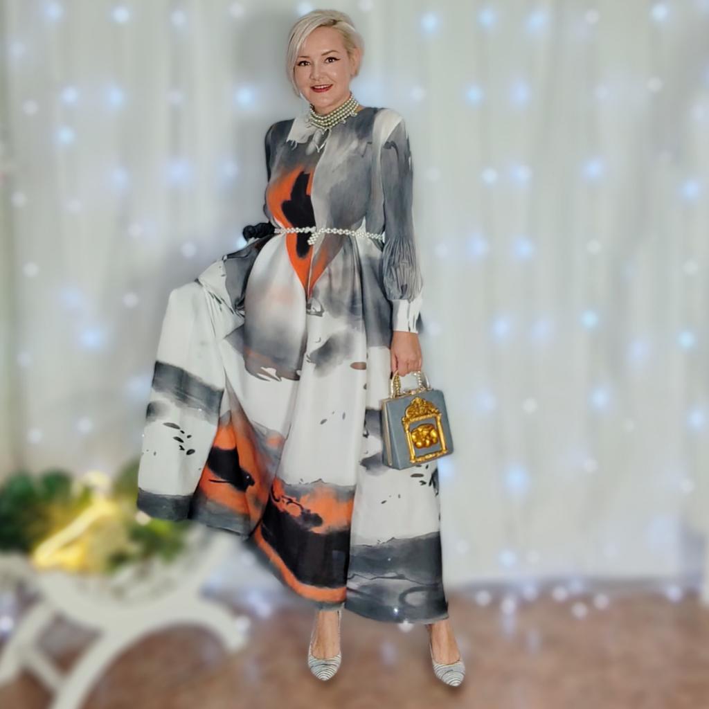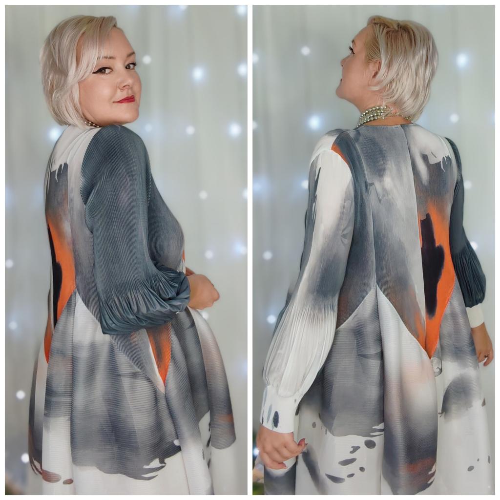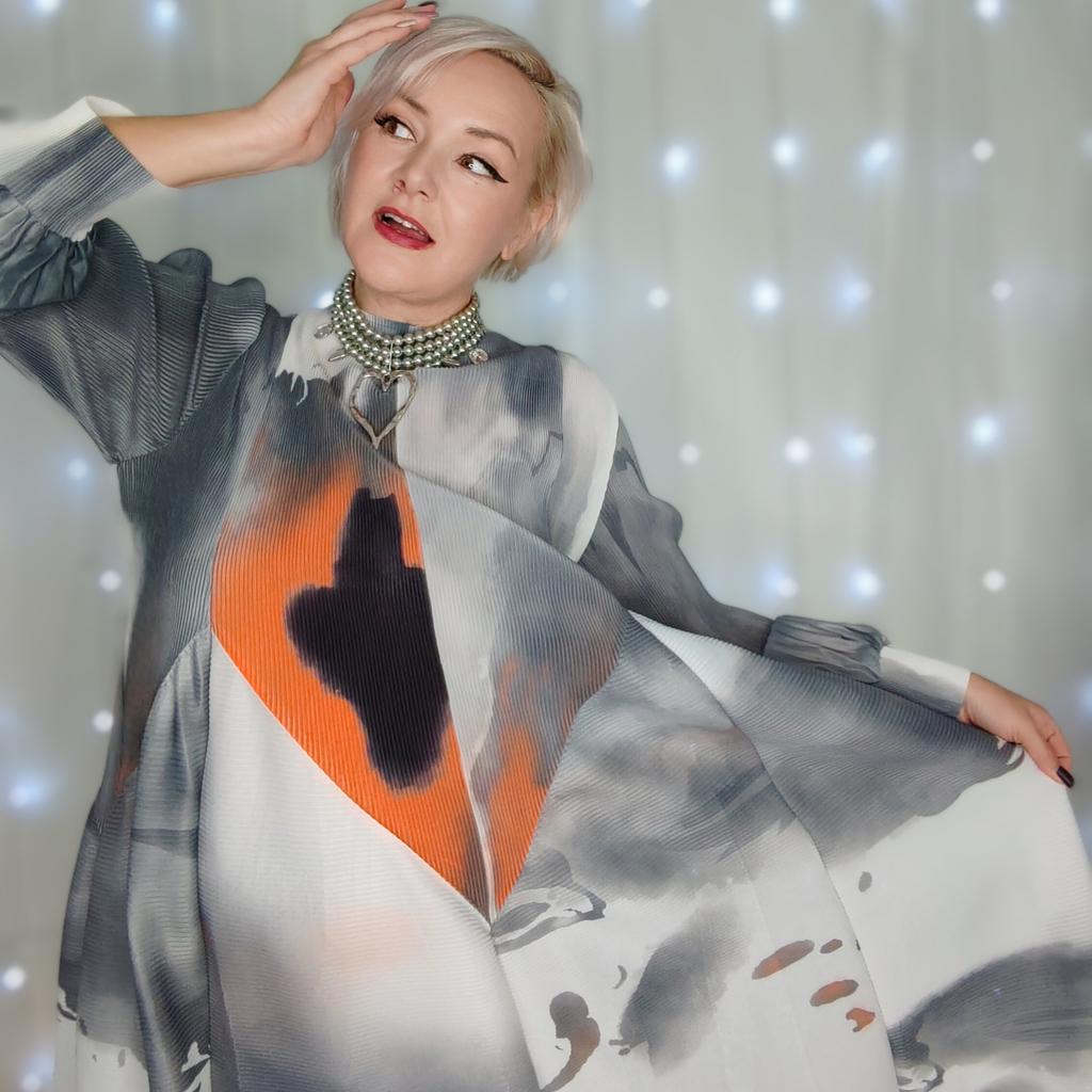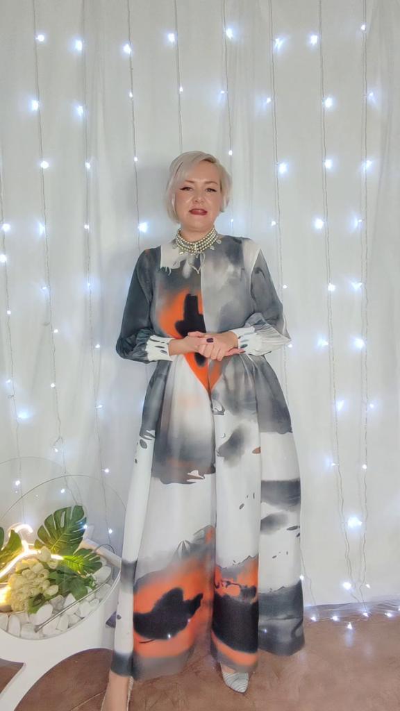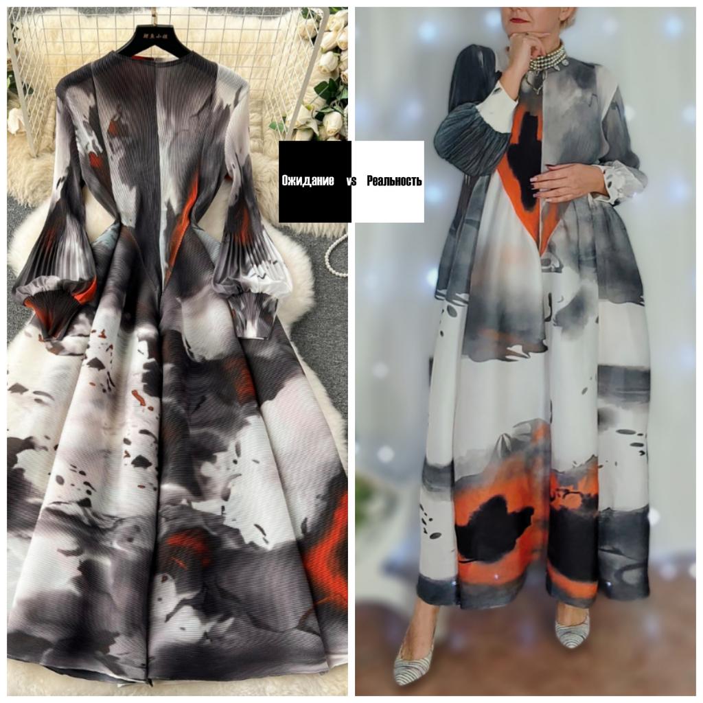 Роскошное платье в винтажном стиле 😍 Привет! Восторг да и только - это невероятное девчат платье, можно сказать изюминка в моей коллекции платьев! Ну, очень красивое с кучей преимуществ. ‼️Добавила разговорное видео, там больше деталей посмотрите перед покупкой ‼️ Ткань: Это шифон выполнен методом мелкого гафре. Такая ткань за счёт плиссе тянется и становится доступной на любые параметры. Ткань не требует утюга, очень приятное к телу, за счёт фактуры держит форму. Немного прозрачное, но на теле за счёт свободы, особенности ткани оно не просвечивается. Дизайн : Платье не имеет пуговиц и молний, они тут и не нужны. Сшито клиньями особенно красивые клинья на талии они реально уменьшают талию сантиметров на 5 (визуально конечно). Низ (юбка) так же состоит из клиньев, но тут особенность в том, что бы юбка имела больше объёма, да в реальности платье пышное без всяких подьюбников. Отдельная красота - это рукава здесь плиссе мелкое и крупное, очень красиво соединили и рукав выглядит необычно и эффектно. Размер: На мне единый размер. Мои параметры : рост 172 см 98/76/106 см Детали: Длина 140 см Плечи 40 (+) тянутся Длина рукава 58 см ОГ 90 до 180 см ОТ 88 до 154 см ОБ реально любой 😁 Резюмирую: По мимо оригинального кроя это платье в очень редкой расцветке - это невероятное сочетание серого, белого черного и оранжевых разводов. Согласитесь - выглядит очень необычно - этот рисунок хочется разглядеть. Кроме того, по моему мнению оно особенно красиво заиграет на вкусных параметрах, больше чем у меня. Такое платье надо уметь носить, так что рост тут тоже важен, чем вы выше тем лучше! Я могу смело рекомендовать! Офигенное! Я не прощаюсь, M_K #птица_феникс