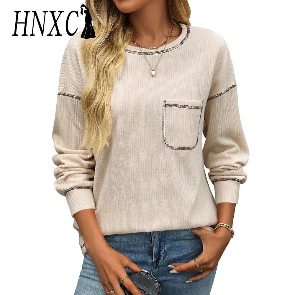 HNXC Женские модные повседневные осенне-зимние однотонные блузки и рубашки с длинным рукавом и круглым вырезом с принтом