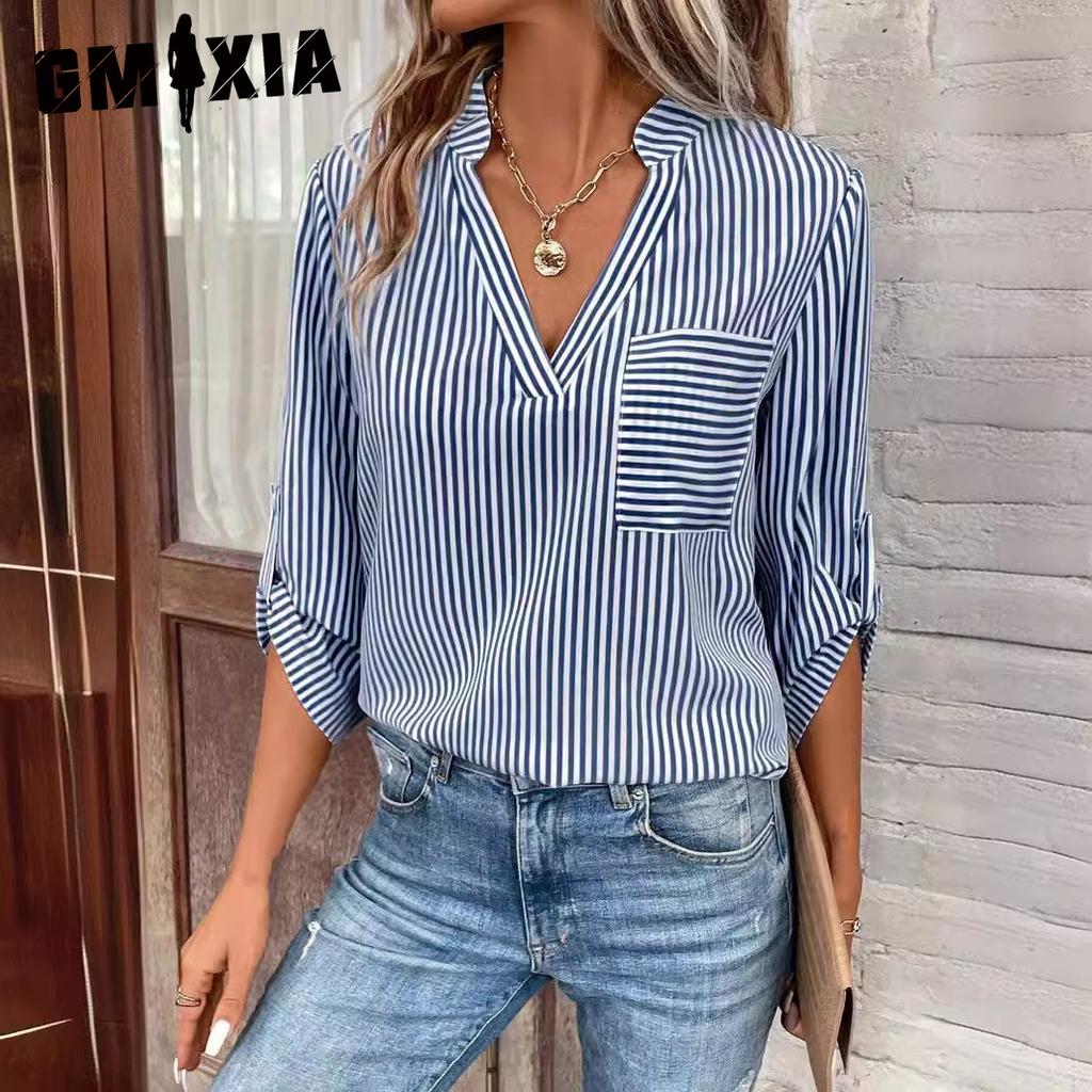 GMXIA Весенний женский свитер с V-образным вырезом и полосатым принтом, повседневная рубашка с длинным рукавом для женщин