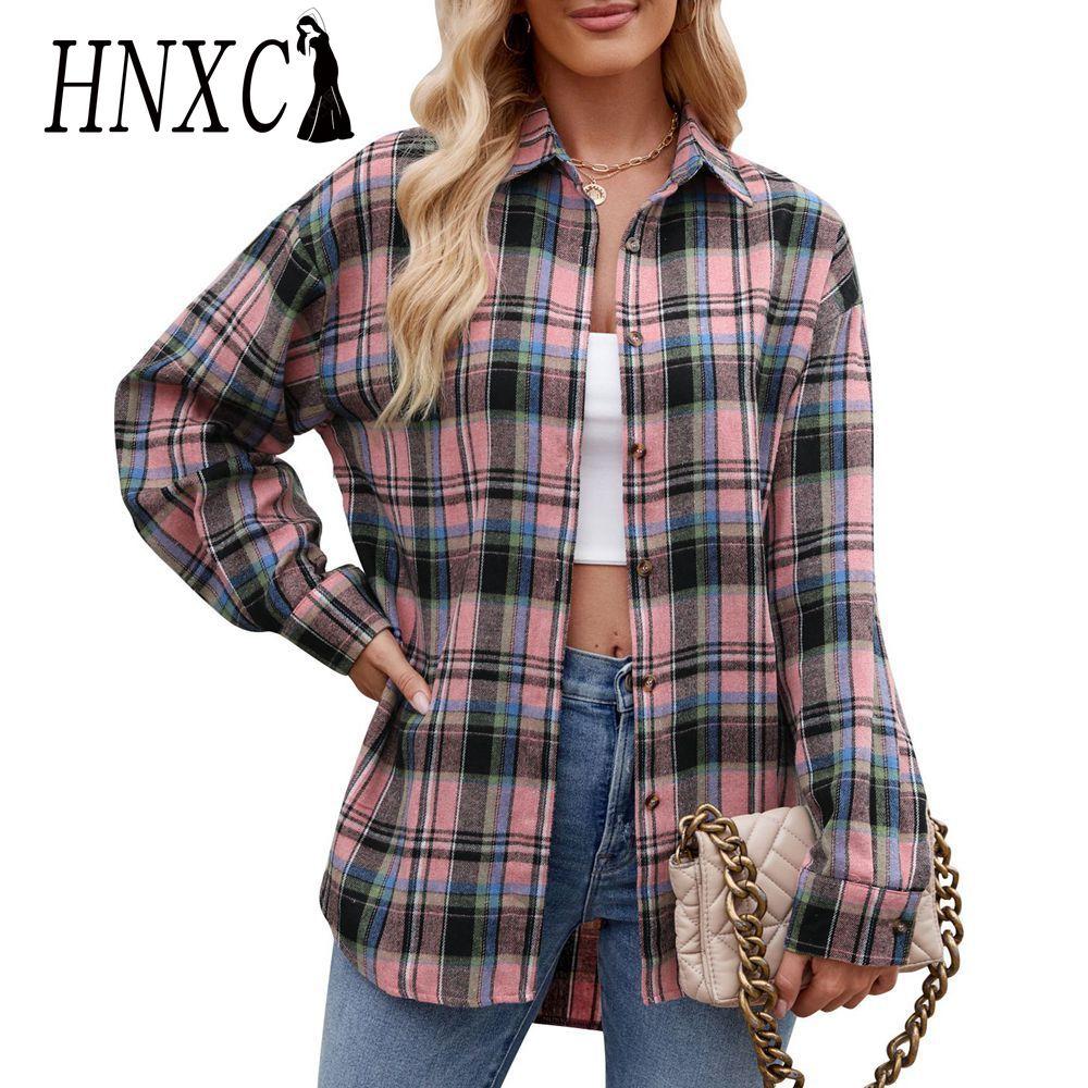 HNXC Женская мода повседневная осень-зима клетчатый принт длинный рукав воротник поло блузки и рубашки