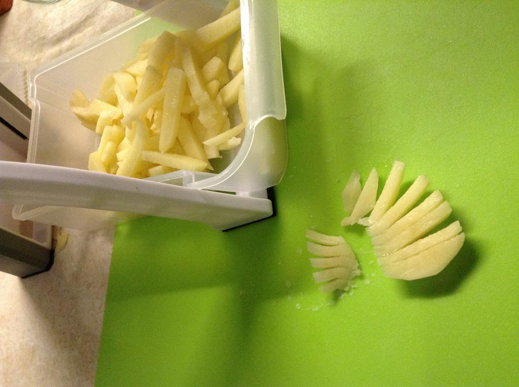 Безопасность шинковки -вот главный козырь! Но конструктор не додумал : под наклонное лезвие сконструировать опорную часть примыкающую с таким же наклоном и фри-нарезка не дорезает в первом слайсе и в последнем-предпоследнем - получаем "горбушку-веер" см фото 2 при нарезке "соломкой" и дорезаем сами. Правда последняя горбушка застревает см фото3 и ее приходится выковыривать перед закладкой следующего овоща. Зато безопасно и быстро можно нашинковать слайсы в 1 см толщиной -не регулируется этот размер, а казалось, что это имеет место.