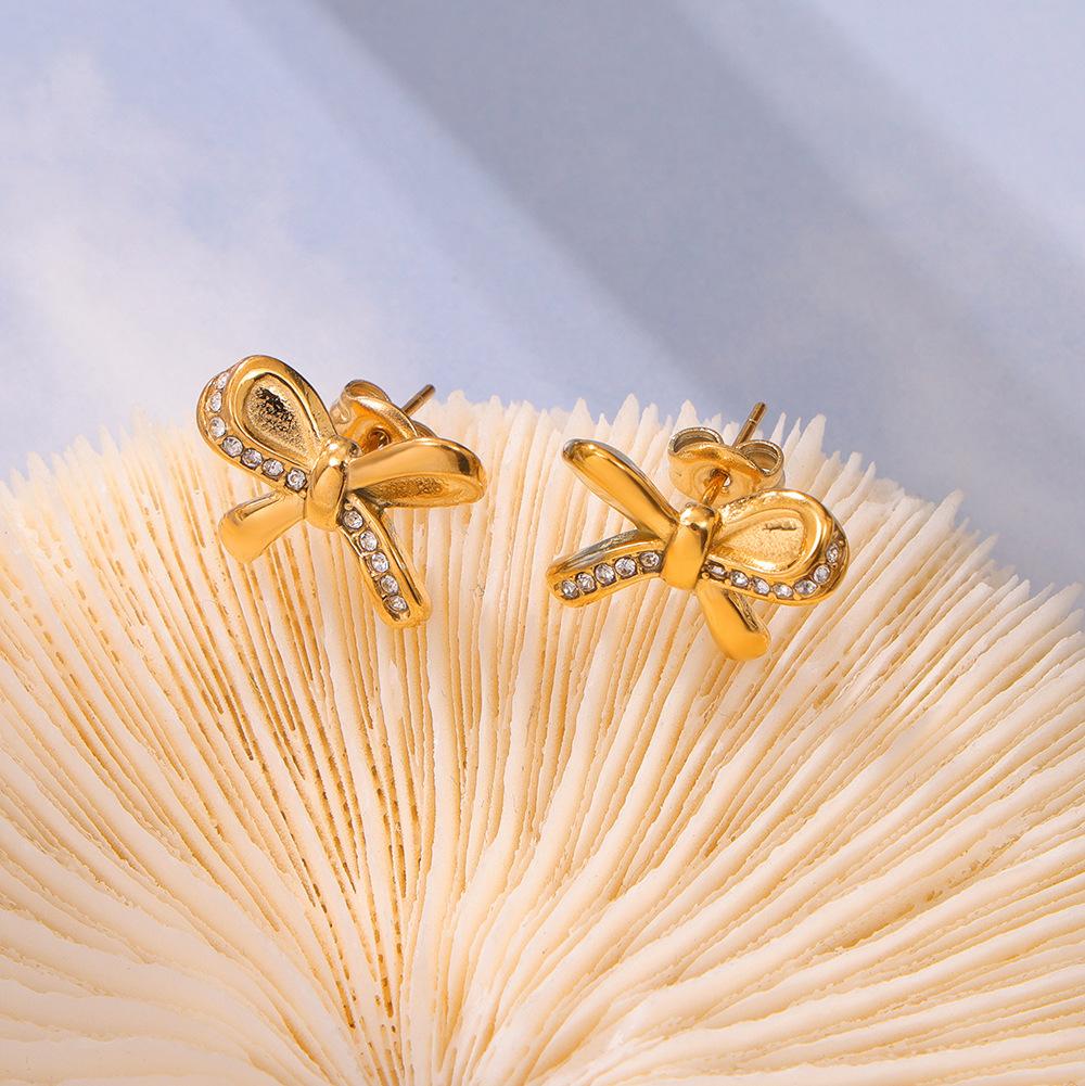Корейская версия простых односторонних сережек-бантиков с бриллиантами, позолоченные серьги из титановой стали, персонализированные универсальные серьги, сохраняющие цвет